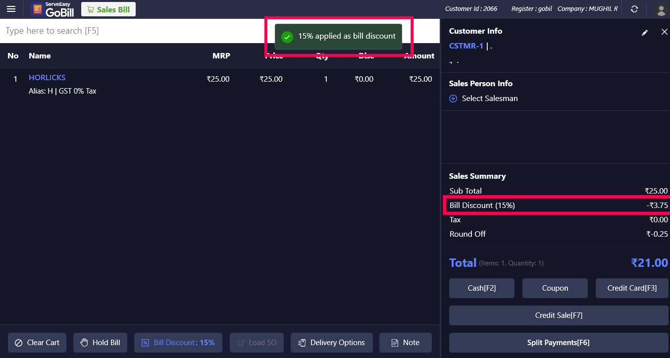 Step 2: In GoBill windows once the session is created, add items to the cart and select the customer from the 'Customer Info' menu. If a bill discount is applied for the added customer, a pop-up can be seen on the top