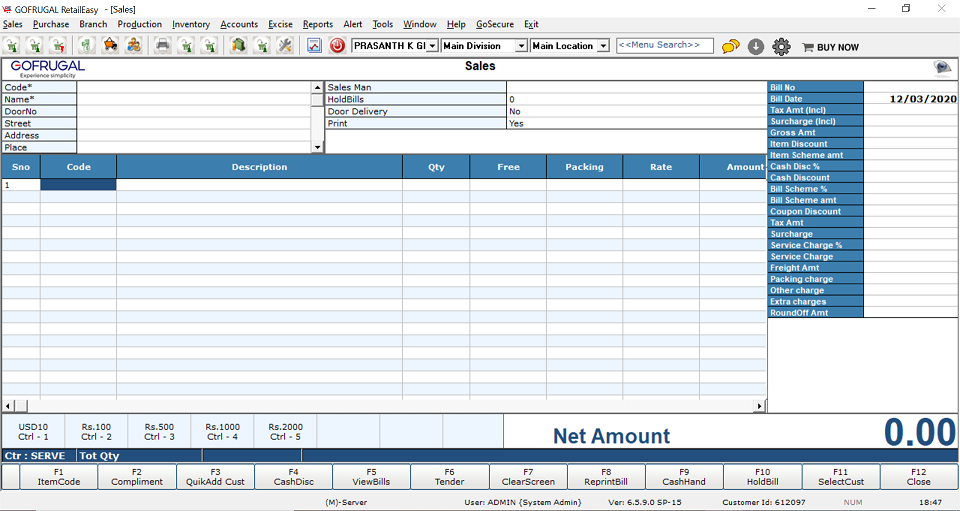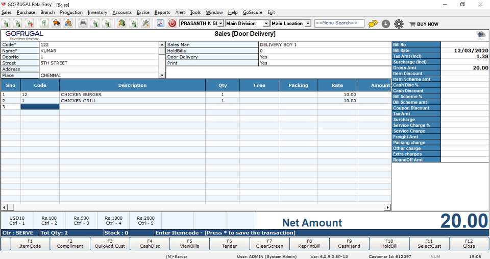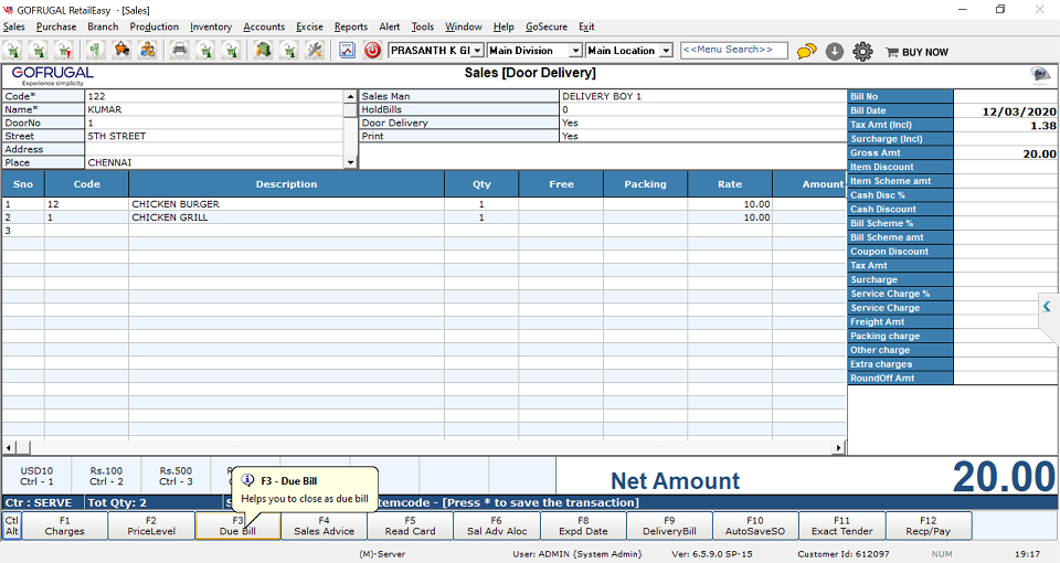 5. If the customer is going to pay at the time of delivery then press Ctrl+Alt+F3 or DueBill button so the bill will be saved as Due bill and when the delivery boy delivers the bill they have to collect the payment.