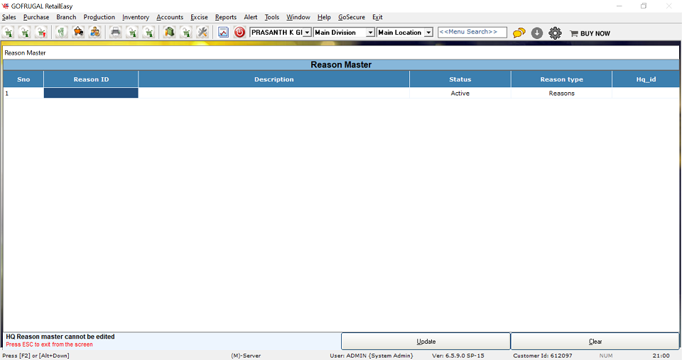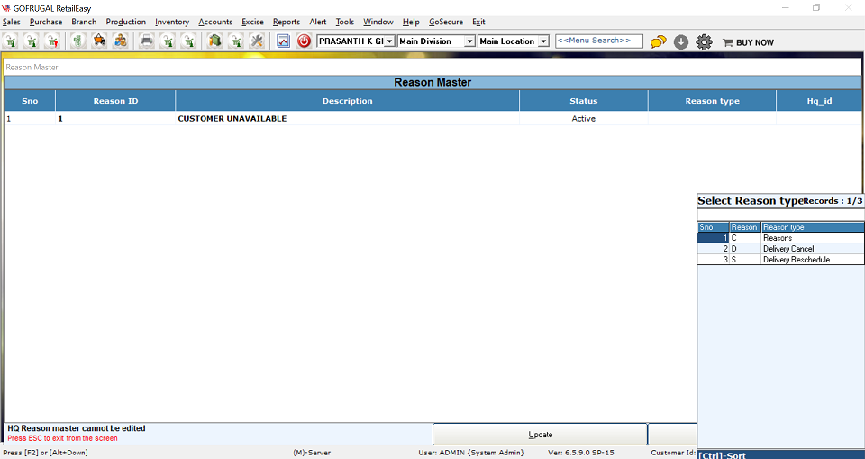 3. After entering all the Reasons click on Update and press 'esc' key to close the window.