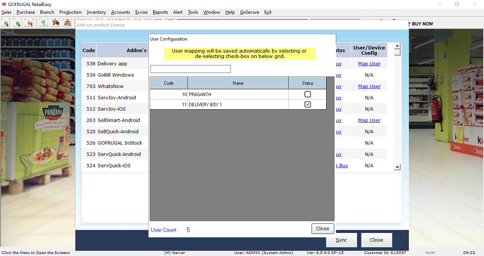 2. For the Delivery App click on the Map User and enable the status for the Delivery Boy using a space bar and click on close.