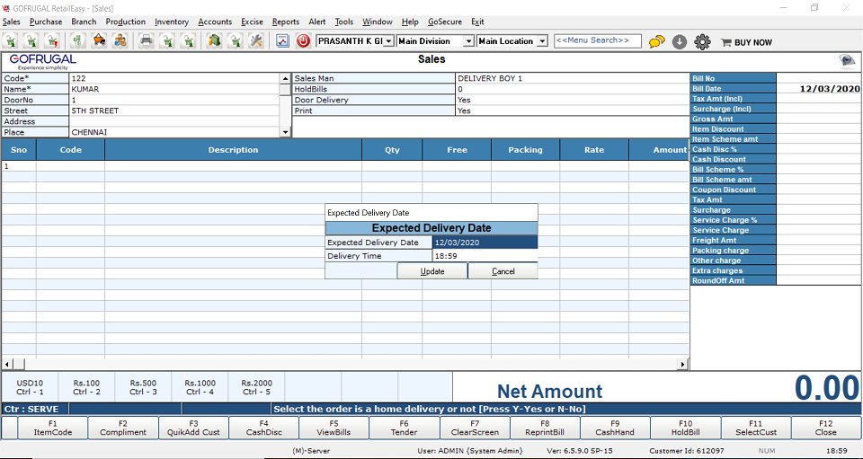 2. Select the Customer, Sales Man, Door Delivery to Yes and enter the delivery date, delivery time and click on Update.