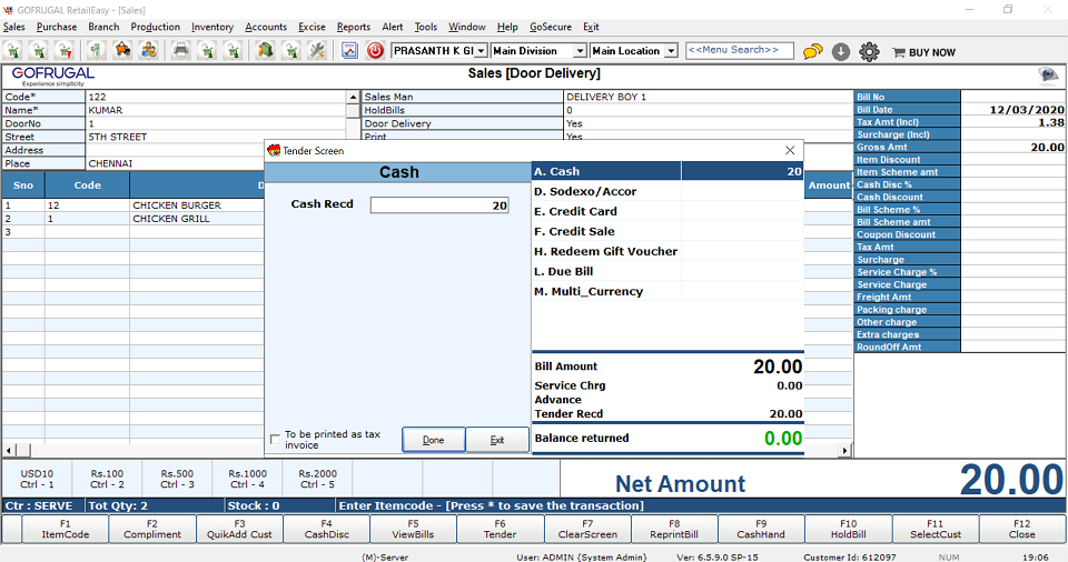 4. If the customer is going to pay immediately then click on F6 or Tender and enter the amount against the payment type and click on done.