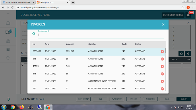 The held purchase entries can be re-loaded by clicking on the PENDING INVOICES button on top of the screen.