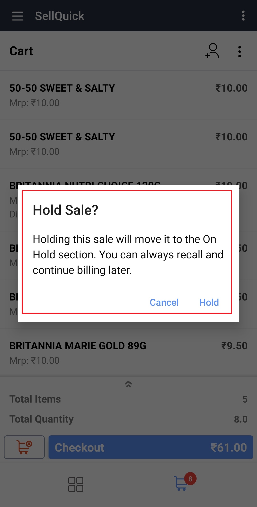 Hold and recall is a function to ensure non-stop billing and also to hold few items in the cart, while the customer is shopping slowly. While the cart is held, other fresh bills can be made. You can later fetch the held cart and complete the bill.