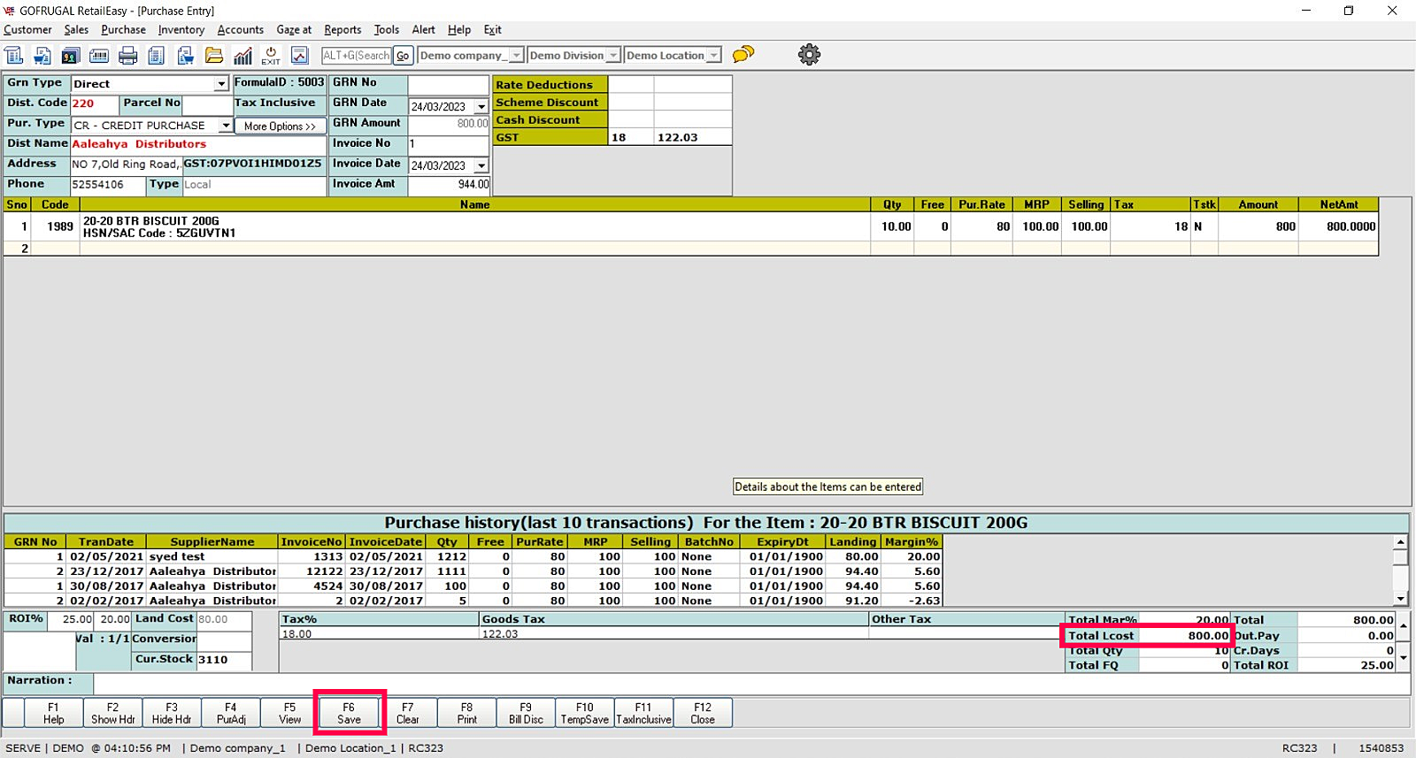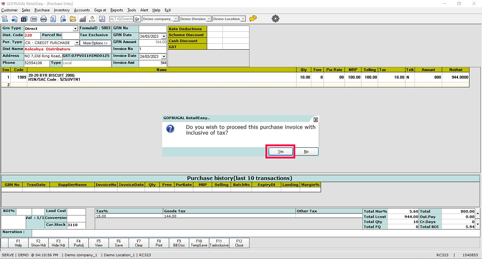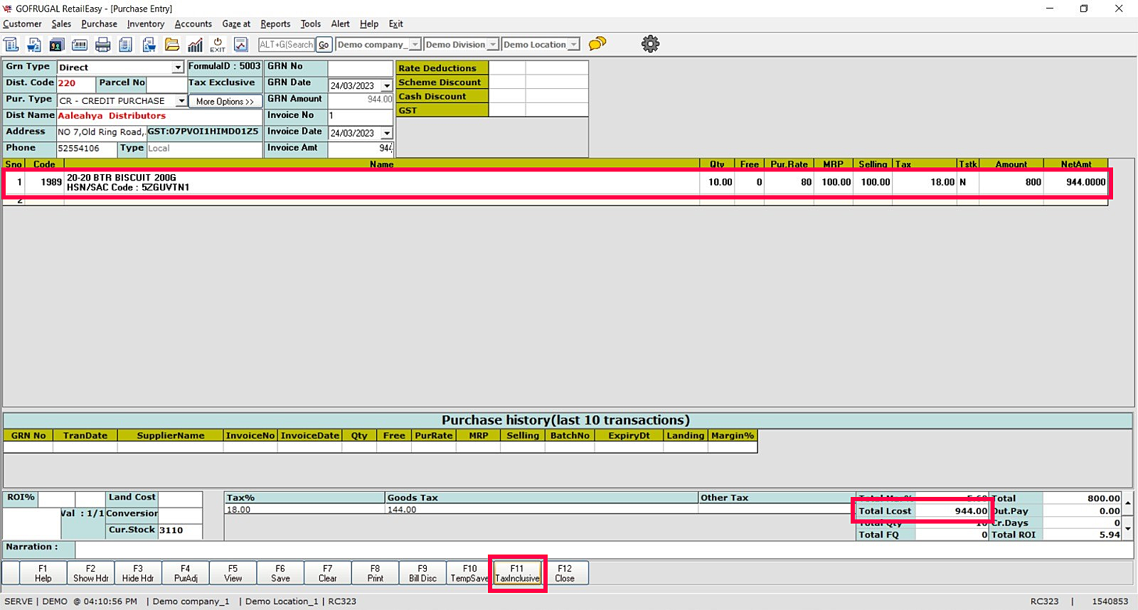 Step 2: Make a Purchase Entry of an Item, Check for the Total Cost. Select 'Tax Inclusive' function key.