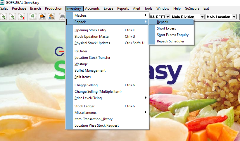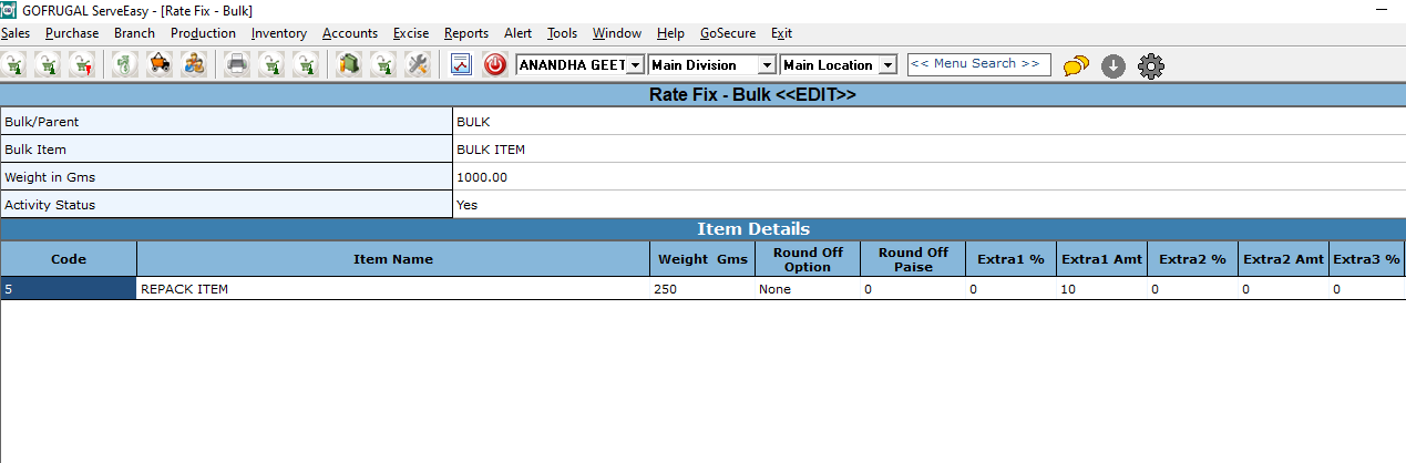 It is simple process of converting bulk rate is 400 for 1KG and for repack item normal rate is 100 for 250 GRAM.Using auto rate fix it is setting mark up of selling rate-10.In repack entry screen it will load selling rate as 110.