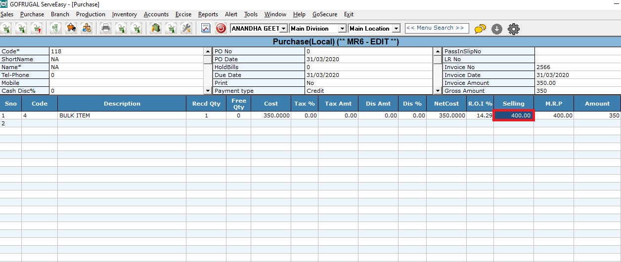 Step 5:After making new inward now open repack screen under inventory->Repack->Repack.After loading the repack item,it will able to under that 400/4=100 should come as selling for repack item instead of that extra amount given on auto rate fix will get added as 100+10=110.