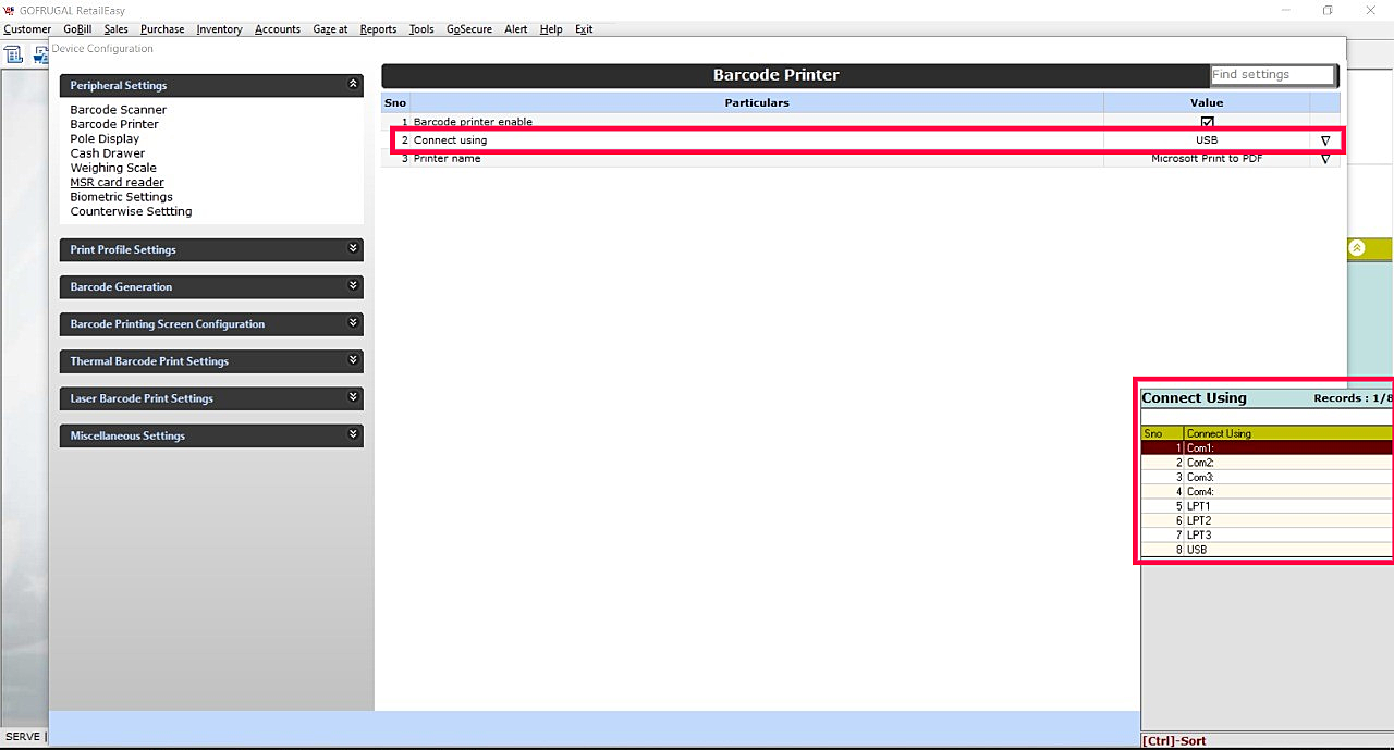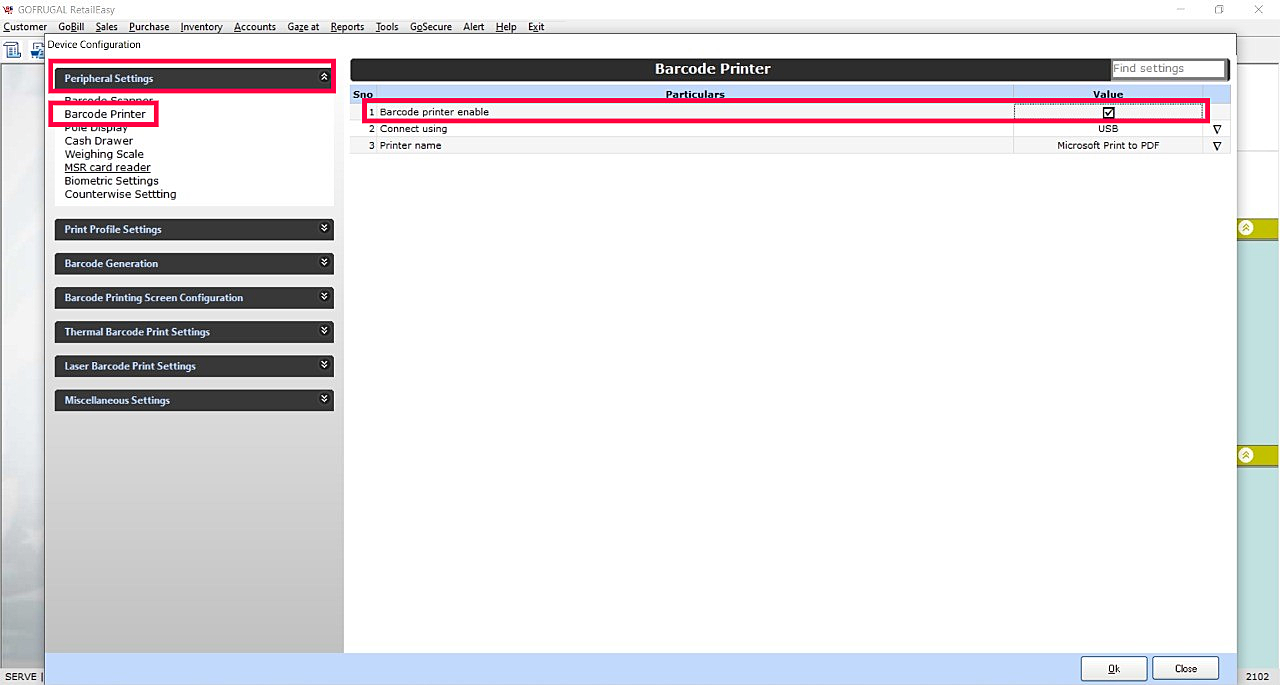 Step 2: Device Configuration screen will appear. Choose Peripheral Settings > Barcode Printer > Barcode Printer Enable (click the checkbox).