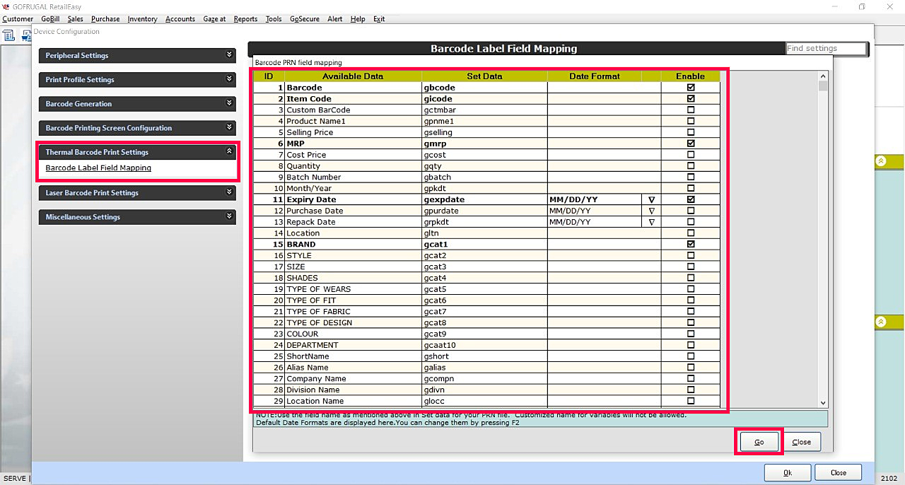Step 5: Go to Thermal Barcode Print Settings > Barcode Label field Mapping > Enable the checkbox of Available Data for Barcode Label field Mapping as per the requirement. Click Go.