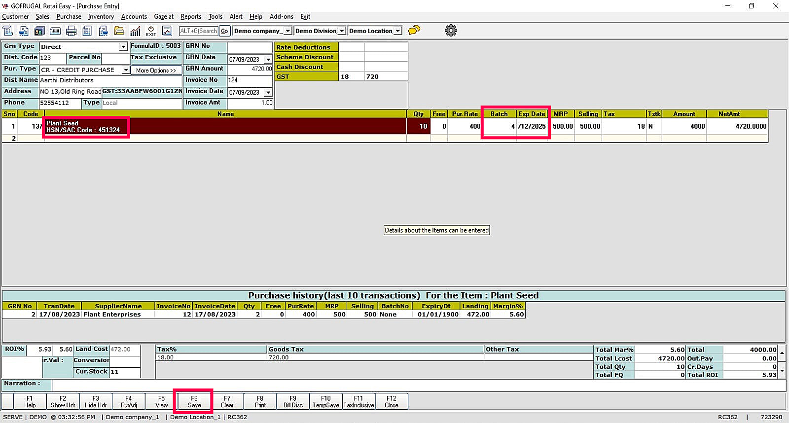 Step 6: Purchase Entry screen will appear. Load the Item and mention the Batch No. & Expiry Date. Click Save.