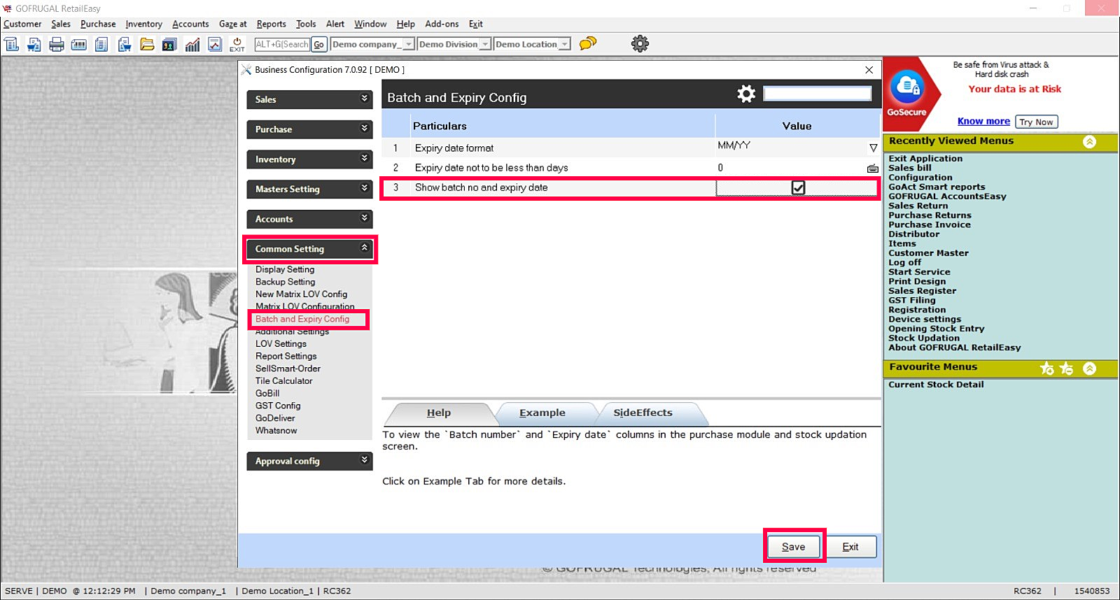 Step 2: Business Configuration screen will appear. Click on Common Setting > Batch & Expiry Config - Show batch no and expiry date (Enable the checkbox) > Save