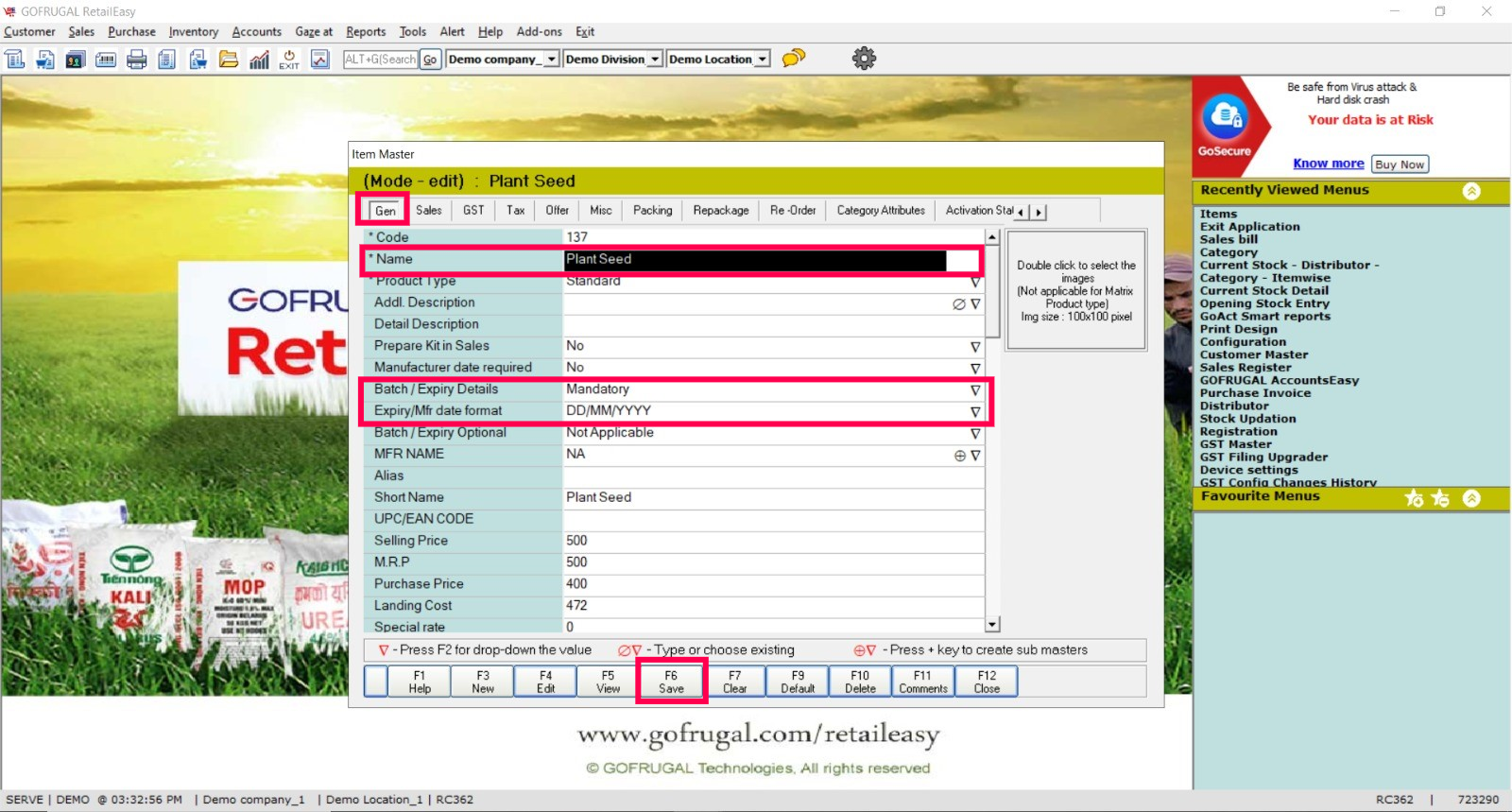 Step 4: Item Master screen will appear. In Gen Tab - Mention the Item Name and choose the Batch/Expiry Details as Mandatory. Then select the Expiry/Mfr date format as per the requirement. Click Save.