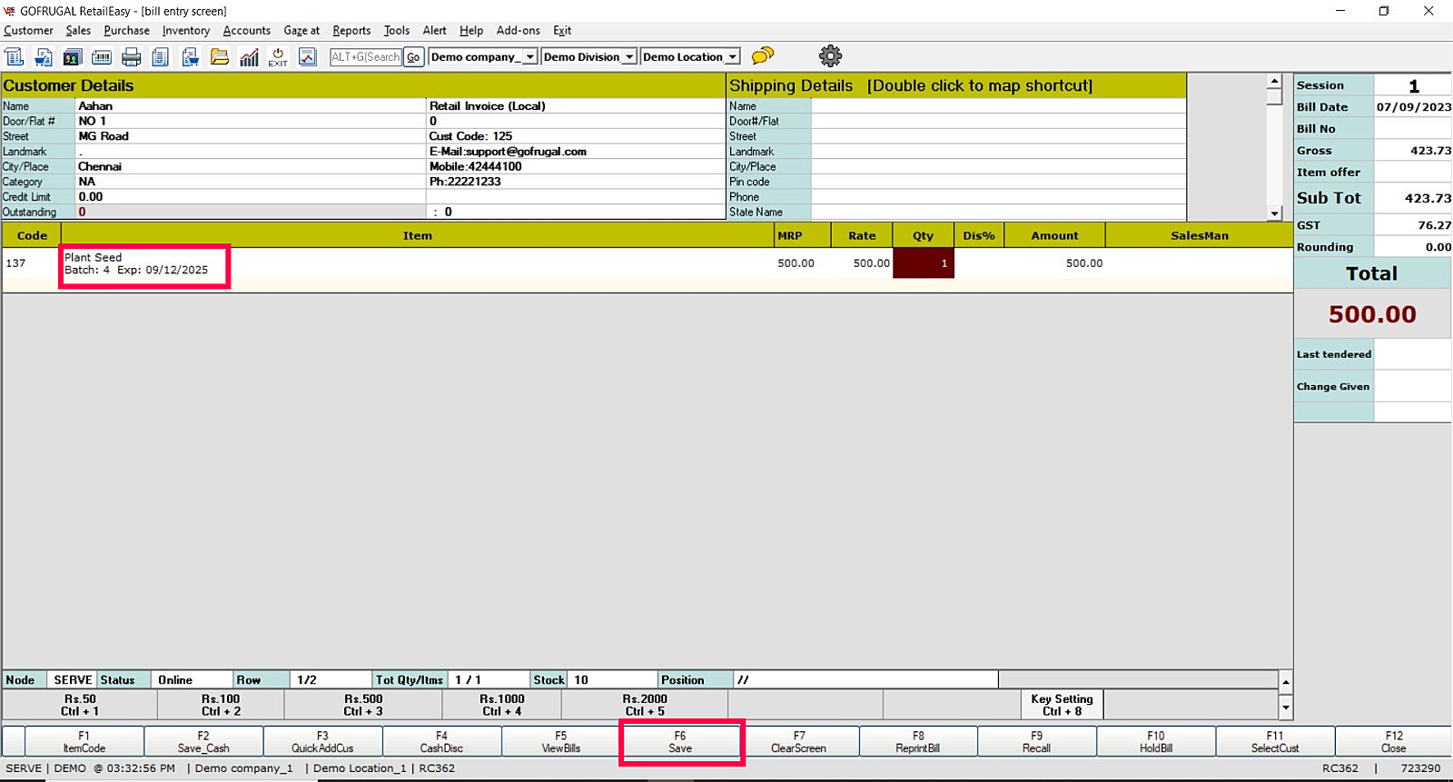 Step 8: Bill Entry Screen will appear. Load the Item - Batch & Expiry Date will reflect. Click Save.