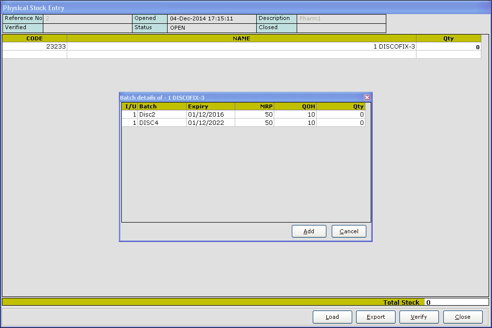 10. Click Add. The quantity is added in the Qty column of the Physical stock Entry screen.