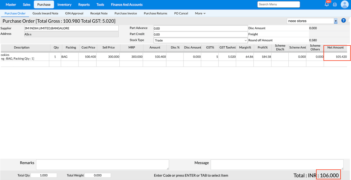 Roundoff Option determines how the amount is rounded based on the Roundoff Paise value selected in Purchase Invoice, Purchase Order, Goods Inward Note, Receipt Note.