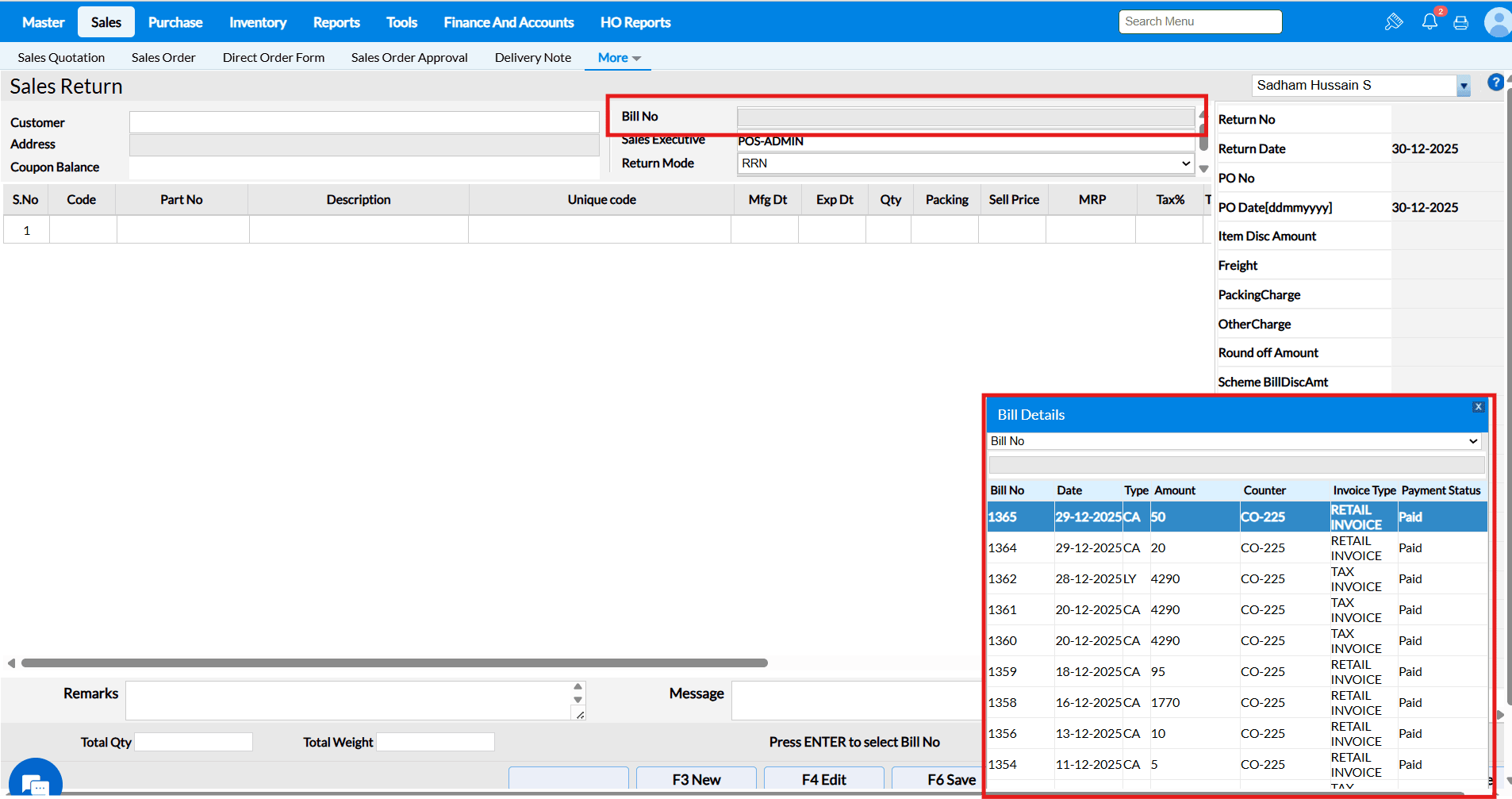 Sale Return Based on Bill No – Enabled