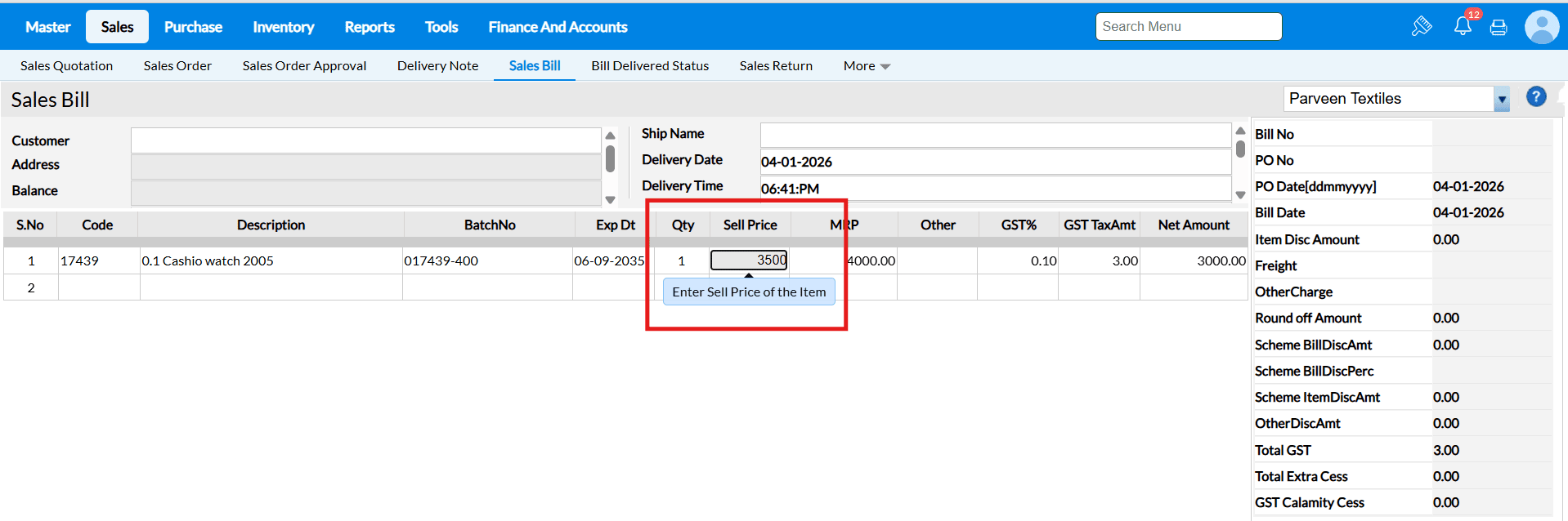→ If we disable the configuration, In Sales Bill screen after entering the qty the cursor will move to next field. Selling price will be auto-picked from Price List or Latest Price from the inventory.