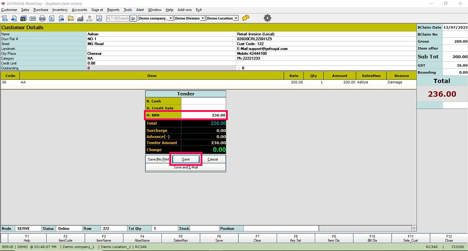Step 3: Tender screen will appear. Choose RRN and click Save.