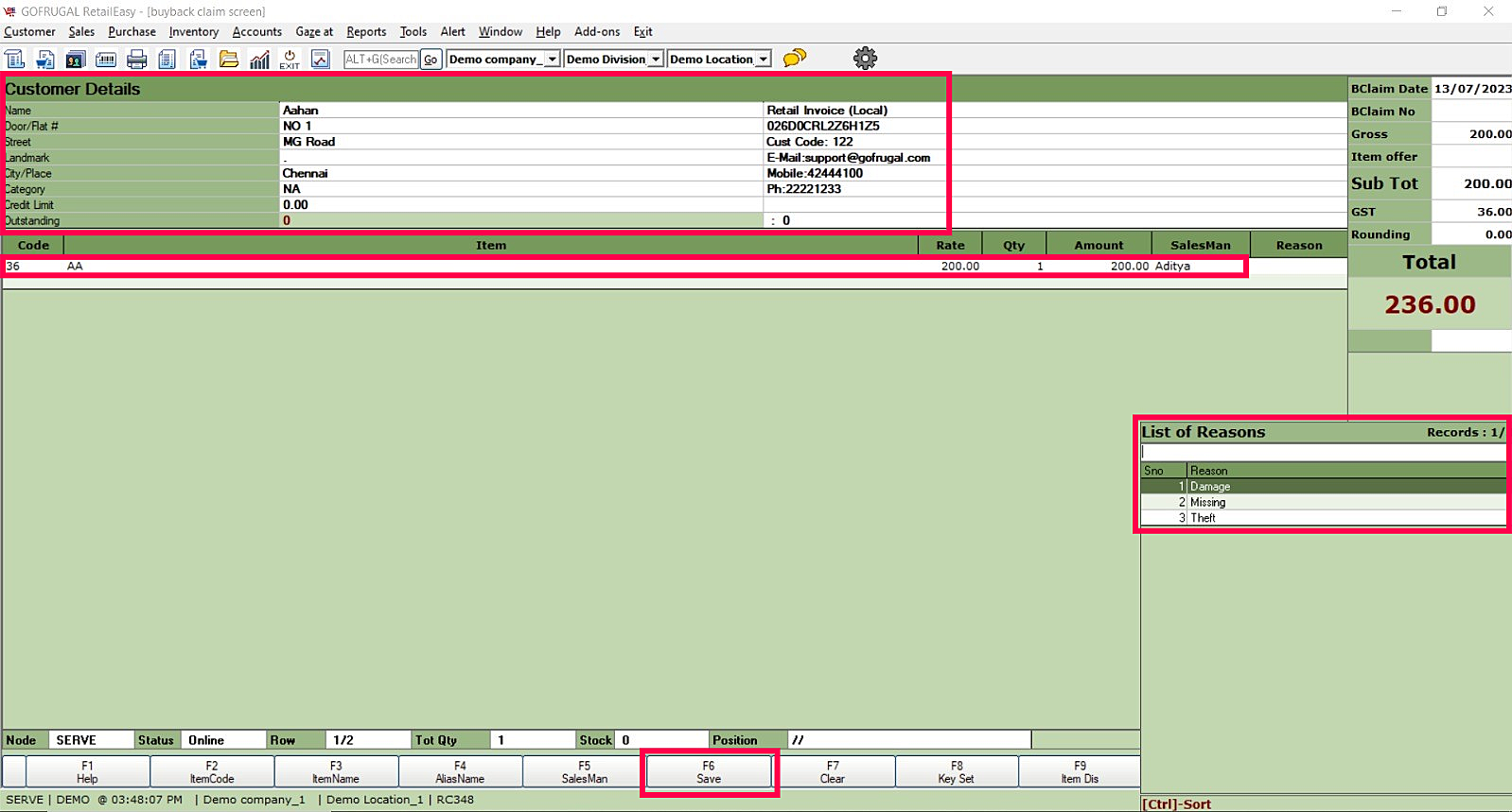 Step 2: Buyback Claim screen will appear. Fill in the customer details and load the item which are required to be returned. Choose the reason from LOV and click Save.