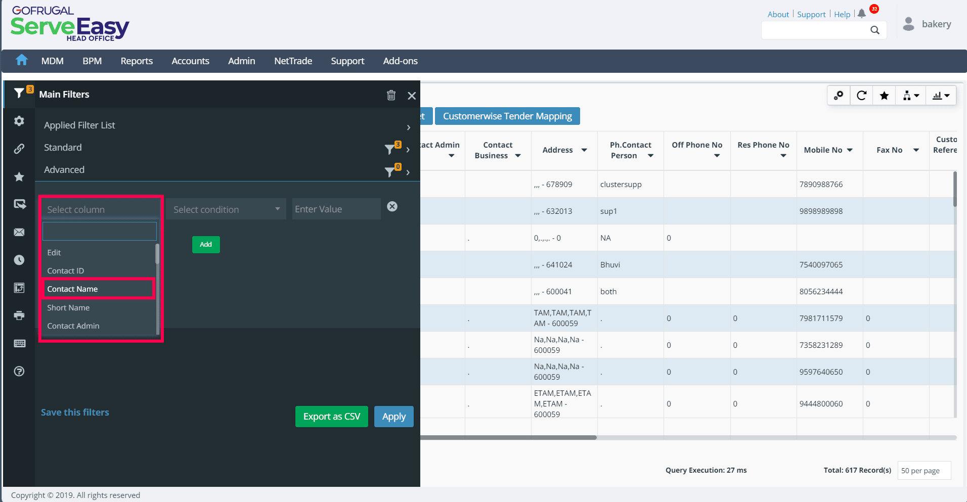 Click on the dropdown menu option under Contact Name. Then filter using "contains" and put the value as "soumin". Then click Apply.