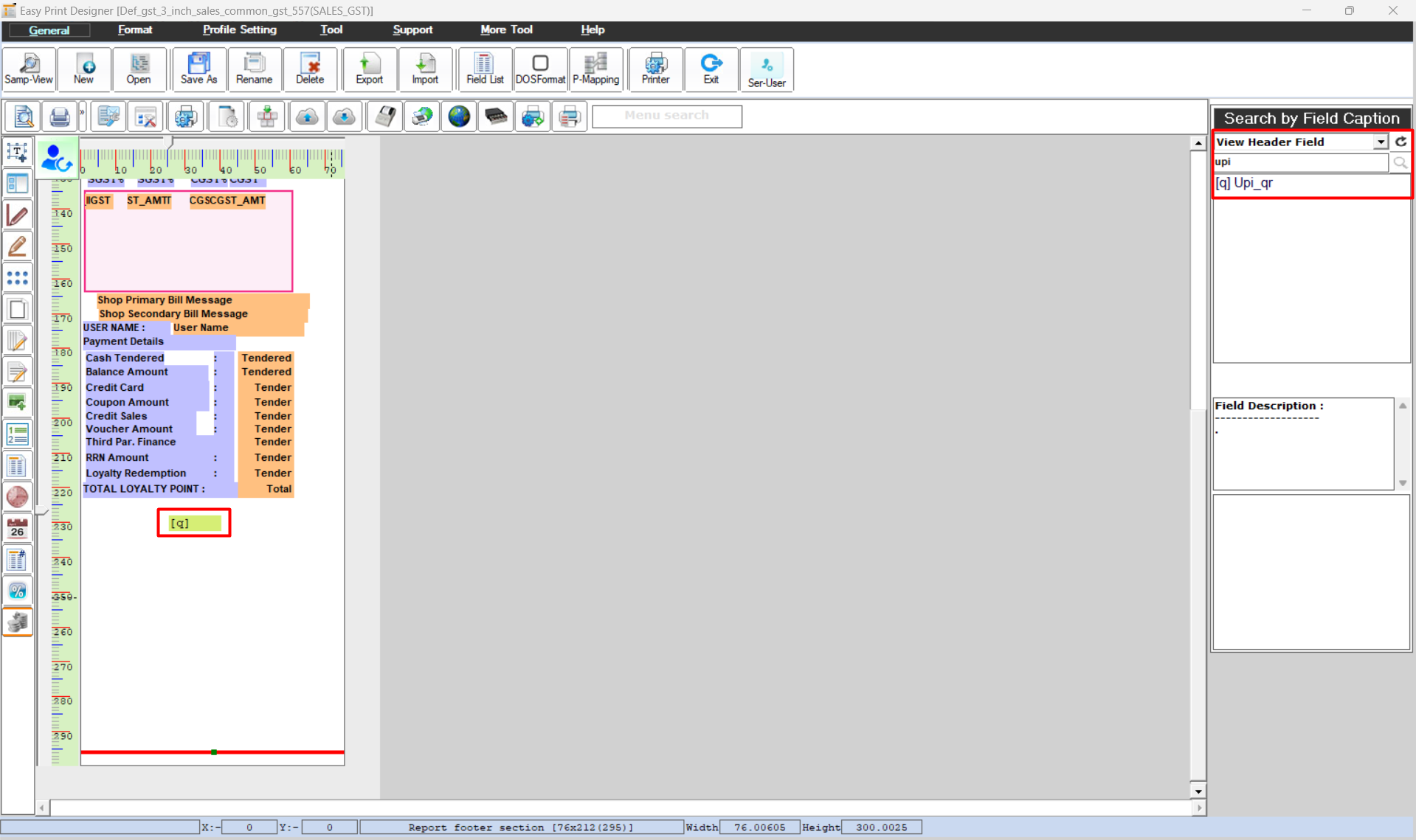 Step 11: Search for the keyword "UPI" and then click on the field and drag it to the design area where you want to display the QR code.