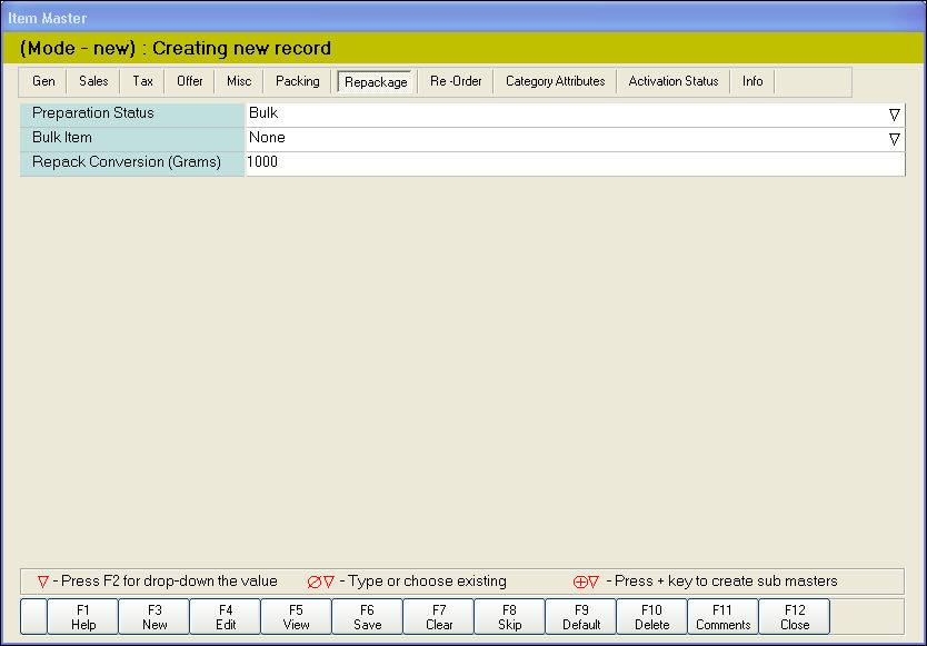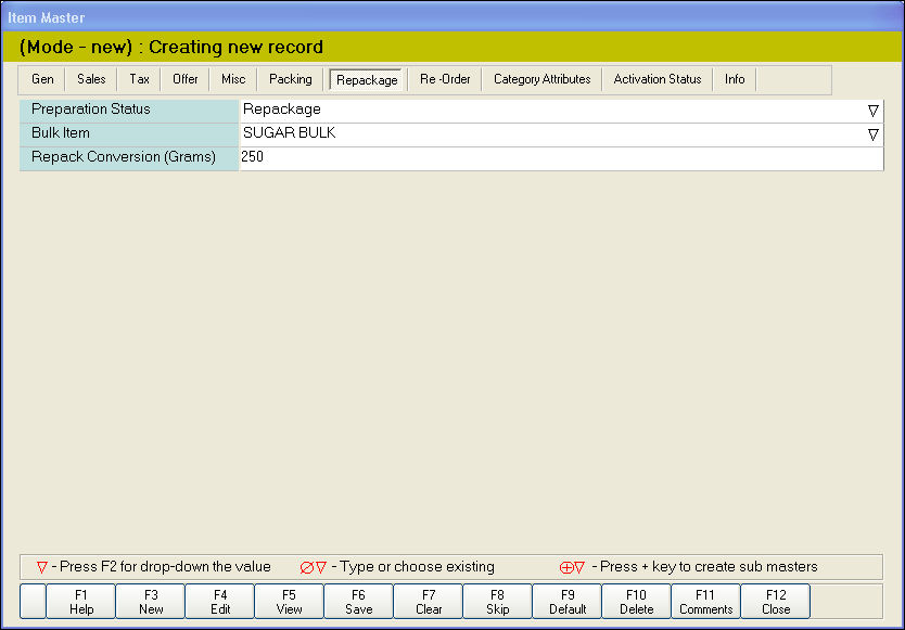 Example: Sugar bulk is a bulk item & the conversion for the bulk is 1000g. Sugar 250 and Sugar 500 are the repack items that are repacked from the sugar bulk. The conversions for Sugar 250 and Sugar 500 are 250g and 500g.