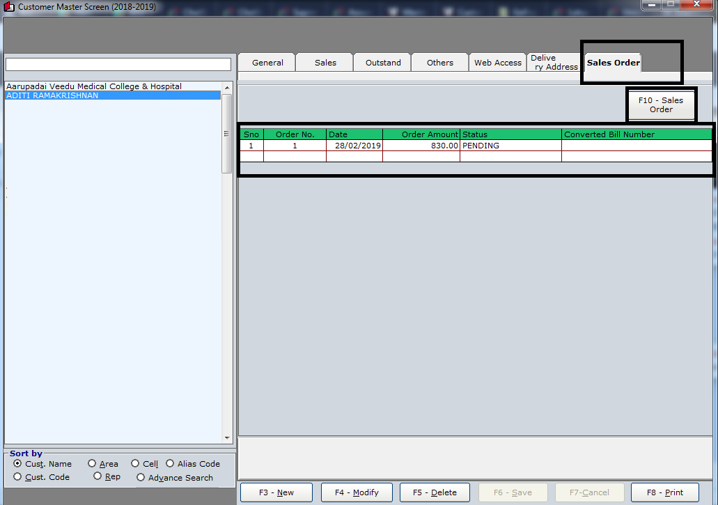 F10 to open the sales order window. If there is any pending order to the customer, it can be viewed in that customer master--> Sales order tab easily.