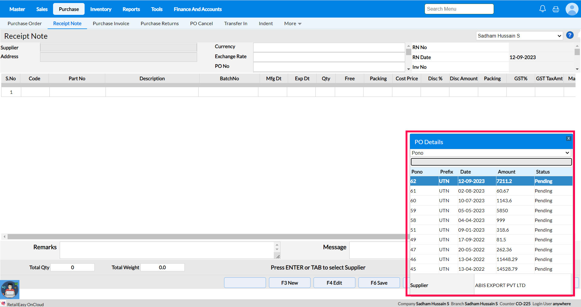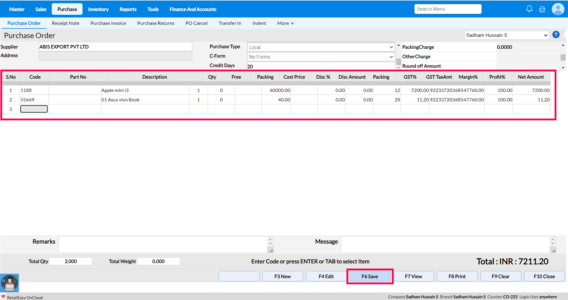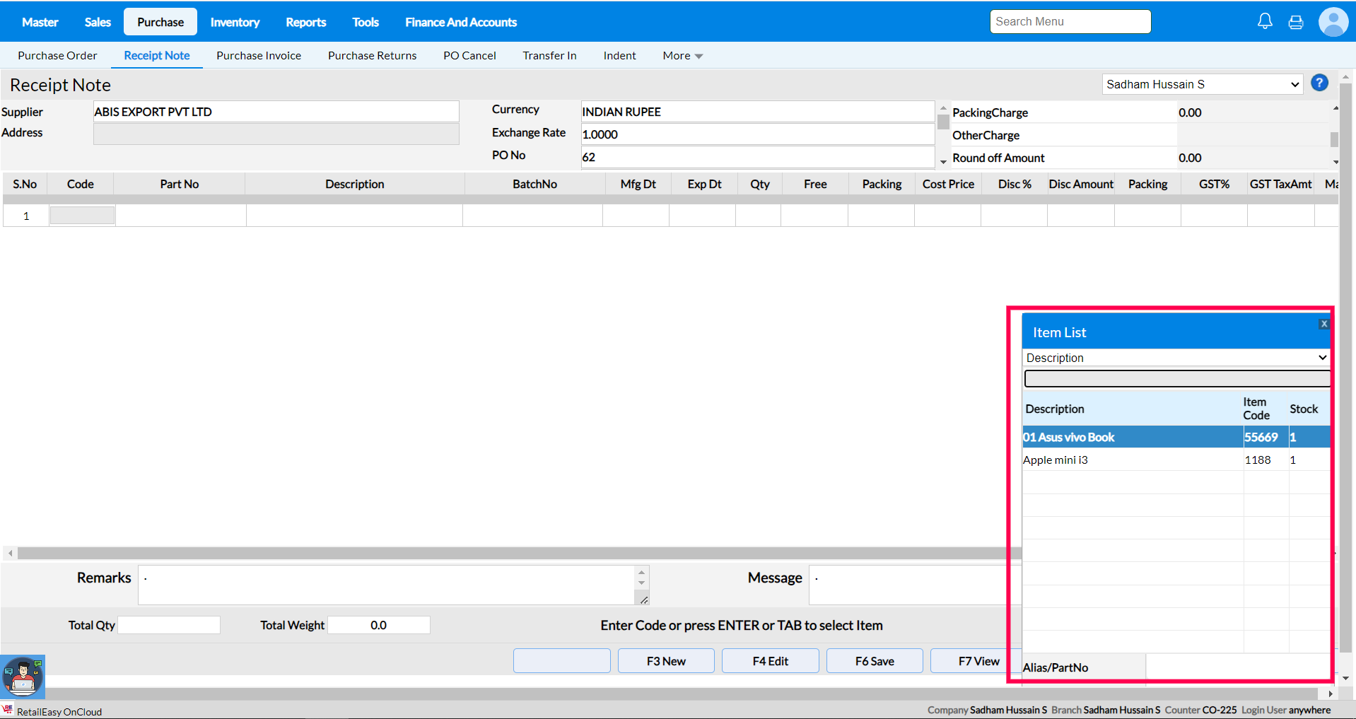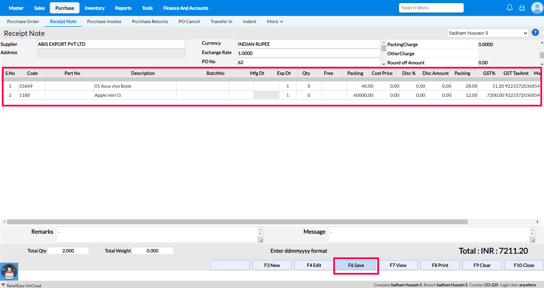 Step 3: After adding all the items for GRN process, click on F6 to save the Receipt Note.