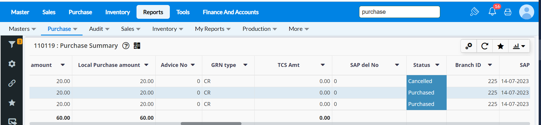 You can check the Status column in the Purchase Summary report by going to Reports → Purchase → Transactions → Purchase Summary report by referring to the below screen shot.