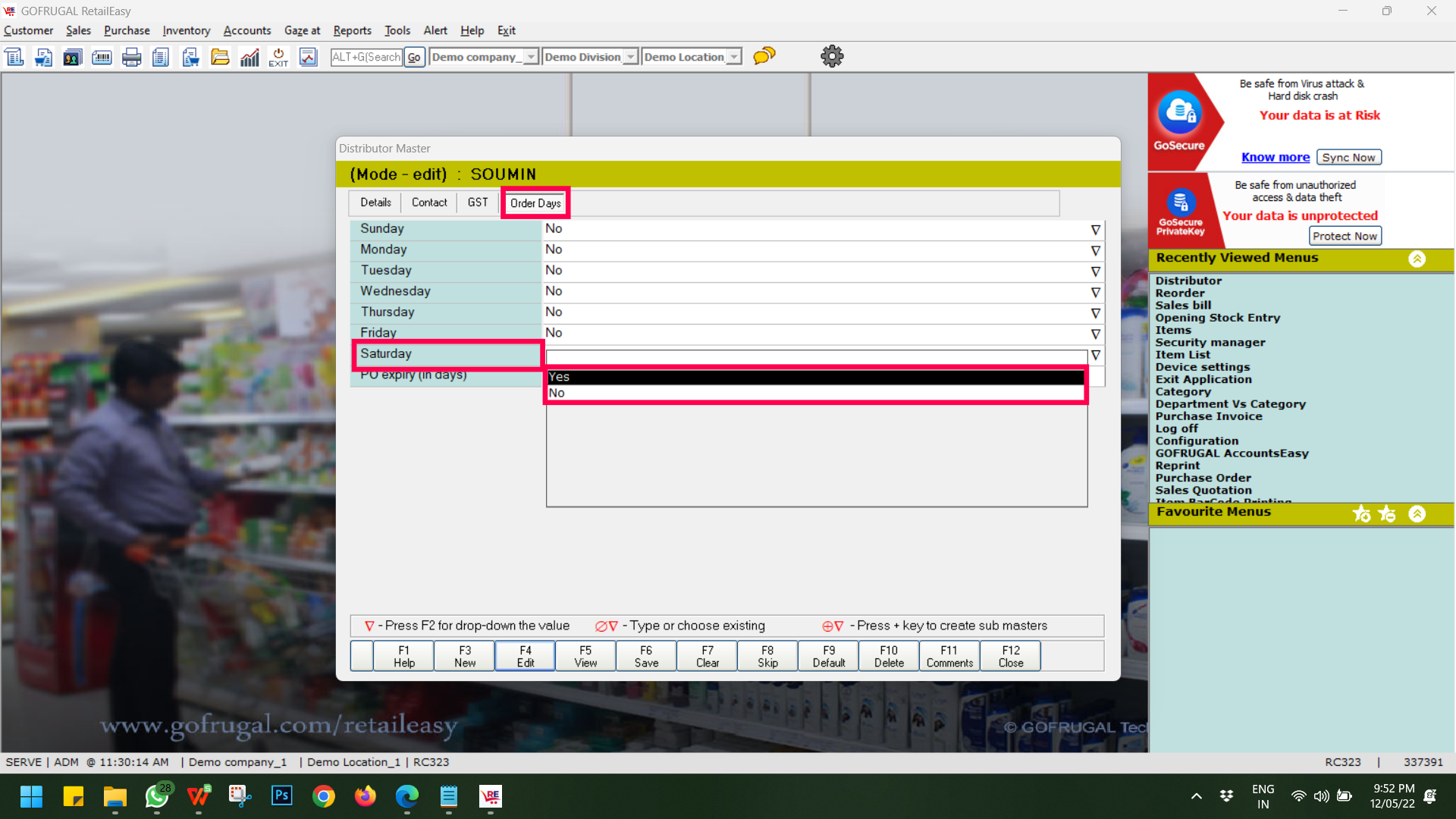 Step 6: Go to the Order Days tab and select your scheduled day. For example Saturday. Set the option as YES.