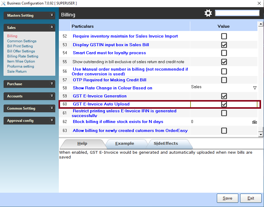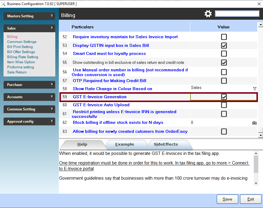1. Click 'Tools' --> 'Options' --> 'Options' --> 'Billing' --> enable "GST E-Invoice Generation" option by pressing space-bar key