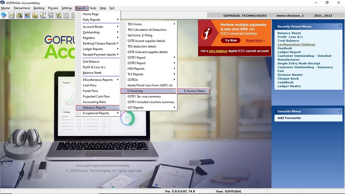 Open 'AccountsEasy' from the Application --> click on 'Reports' --> click on 'Statutory Reports' --> click on 'E-Invoicing' --> click on 'E-Invoice Status'