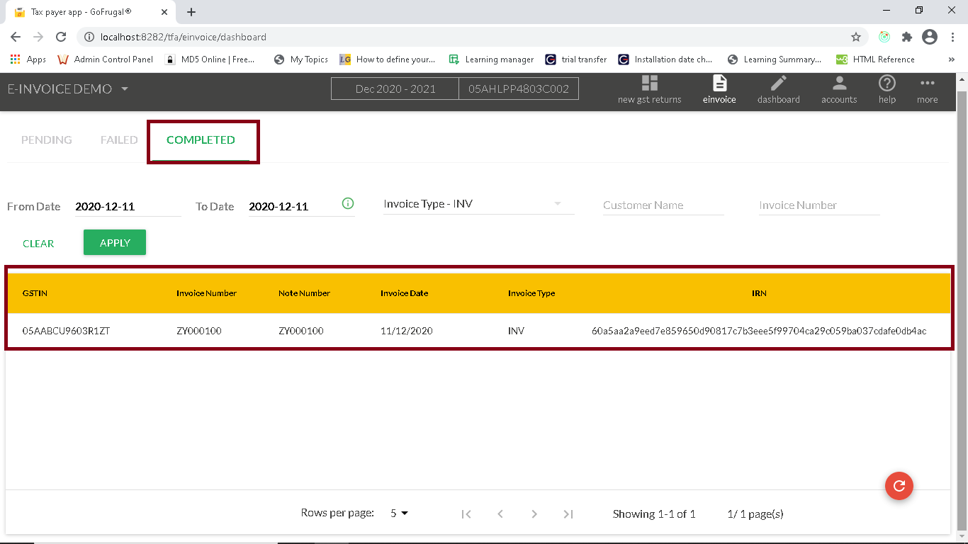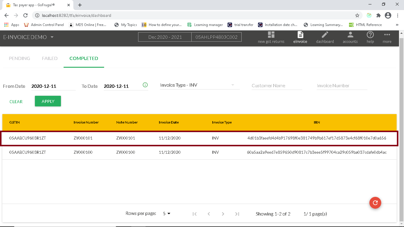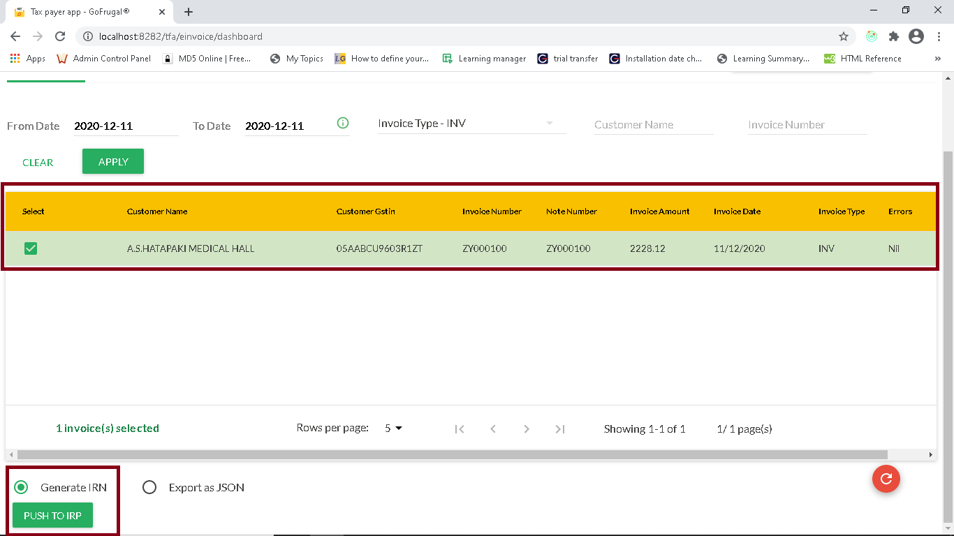 4. Under the pending tab, it will list out all the pending invoices for generating the IRN