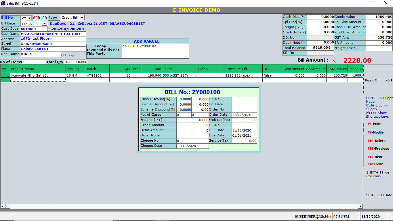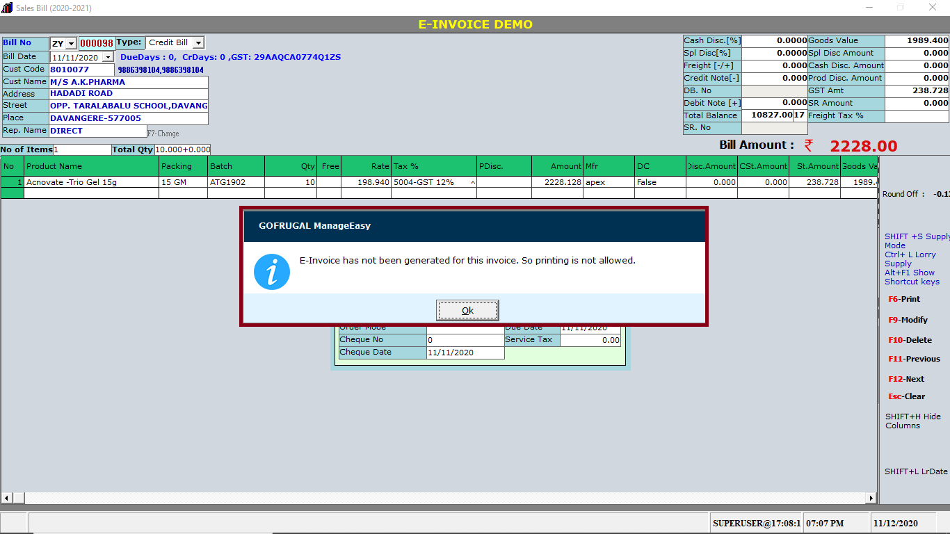 9. If the option 'GST E-Invoice Auto Upload' is enabled, On Selecting a registered customer and making a bill entry, the IRN will automatically be generated and pushed to IRP