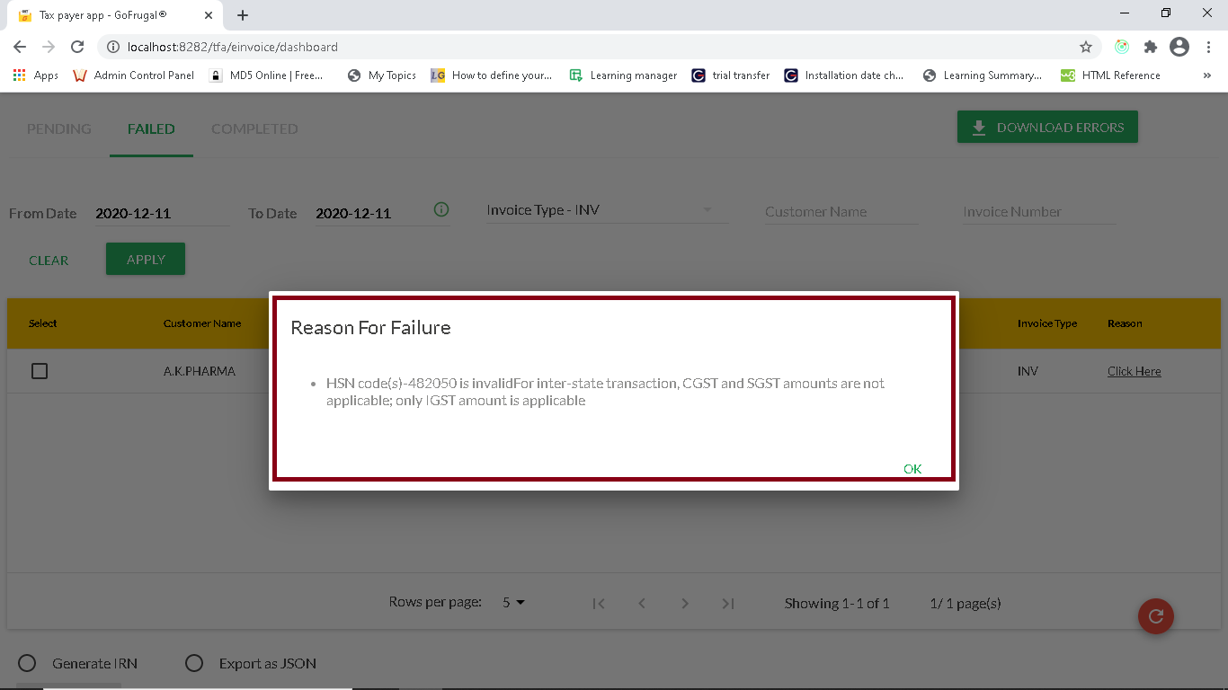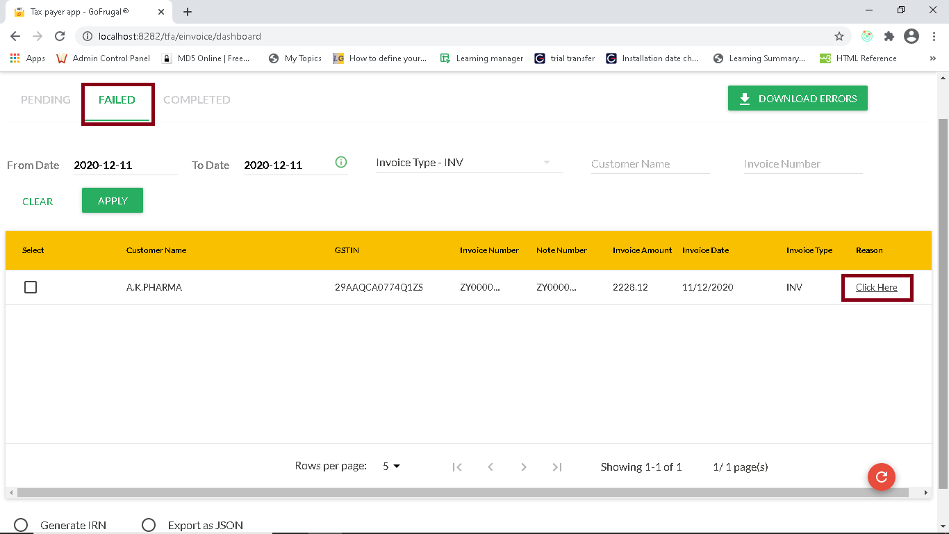 8. Under the 'Reasons' tab, click on 'Click Here' against the invoices to view the invoice wise errors