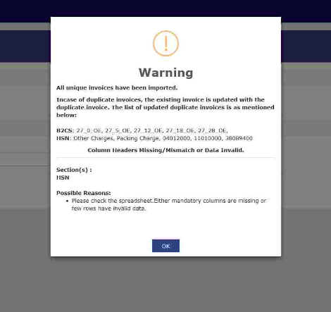- After downloading, if there are errors in the data, a warning message will be popping up saying what are the errors in the exported data. Similar to the above image