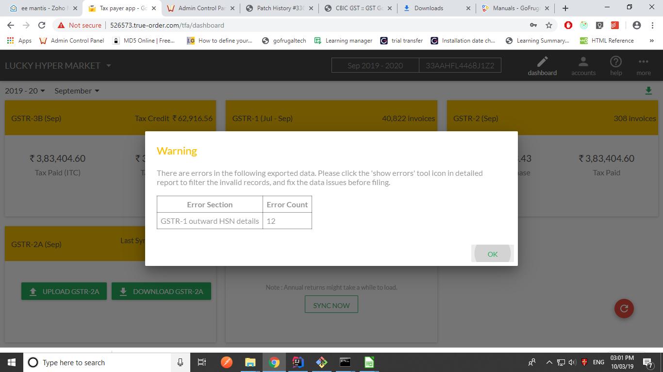 - If still error persists, export as excel and import the same file to GST OFFLINE TOOL which can be installed from GST portal website. After installing import the excel by selecting the same month and financial year for which the excel is exported in TFA. It will show the error rows. Please fix them and try again