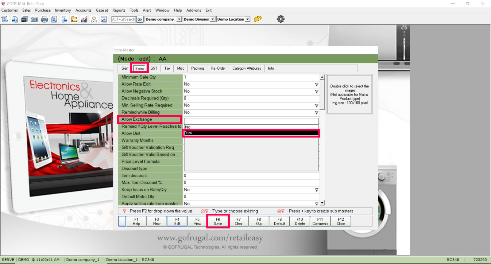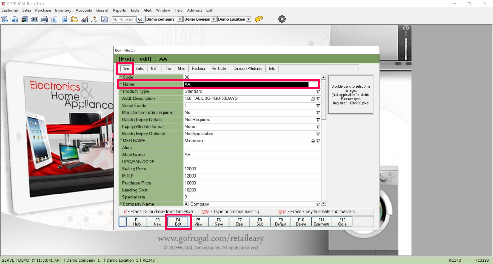 Step 2: Item Master screen will appear. Click 'Edit' function key and load the item to be exchanged.