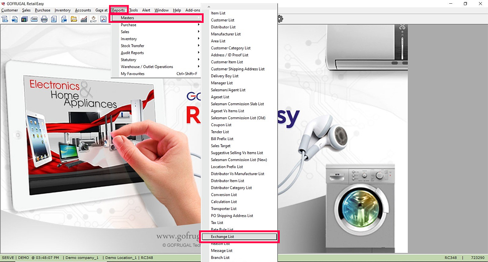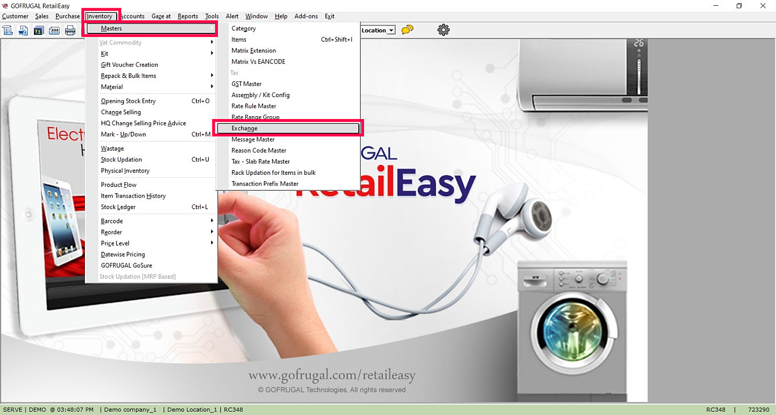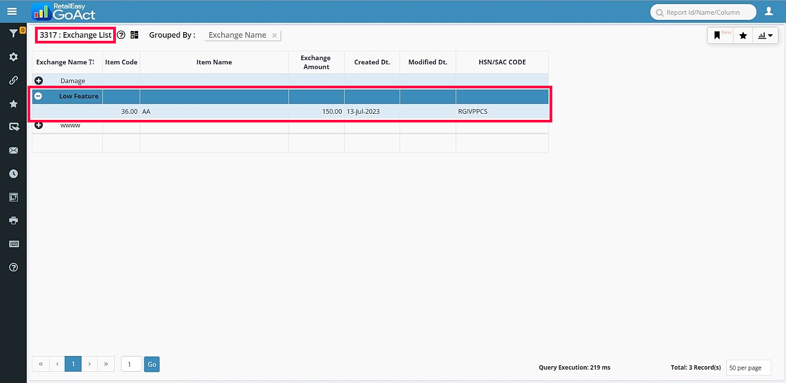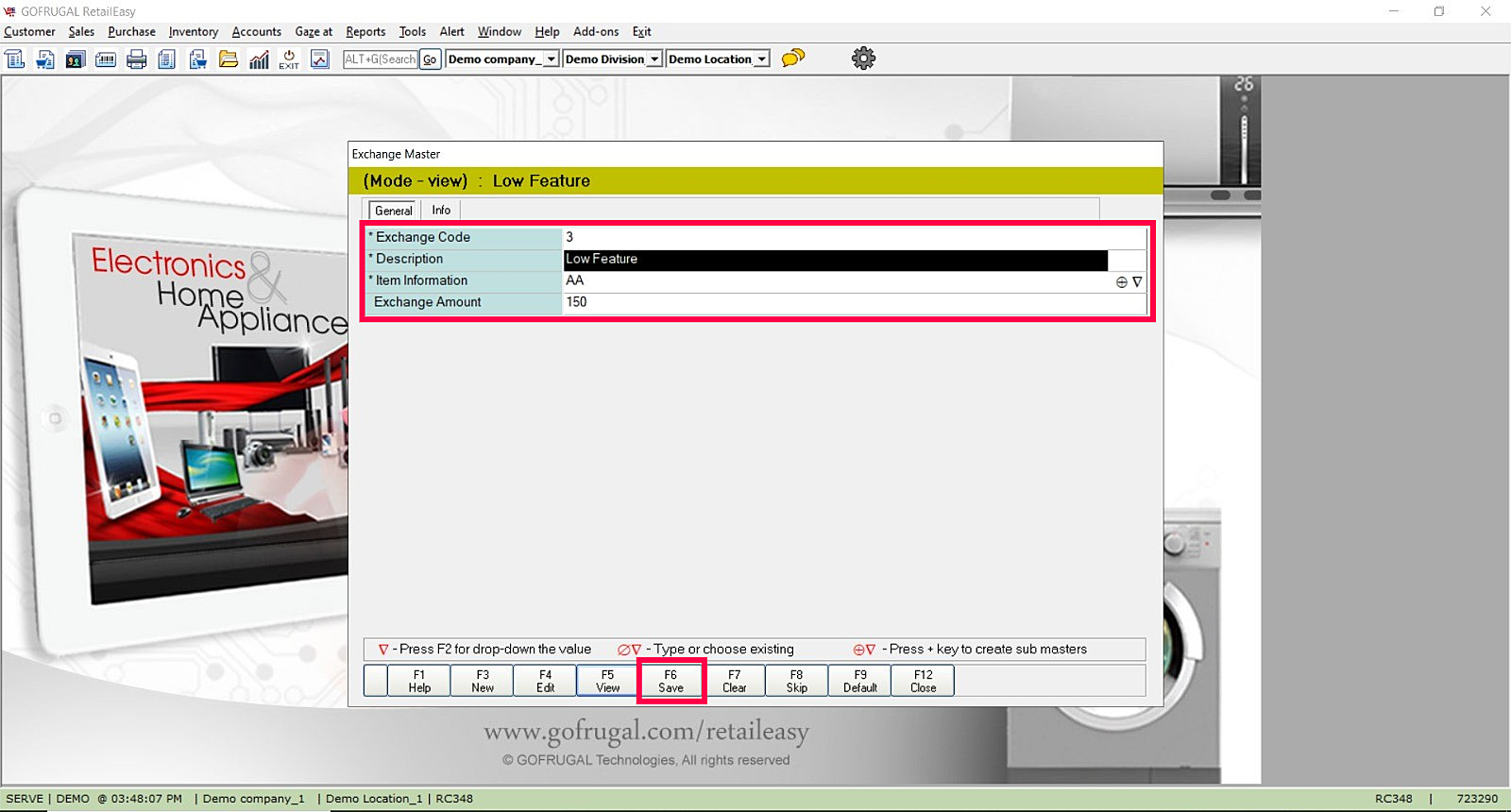 Step 2: Exchange Master screen will appear. Fill in the details as Description, Item & Exchange Amount.