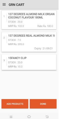 6. Click on ADD PRODUCTS to add more items received from your supplier to the cart (or) click on DONE
