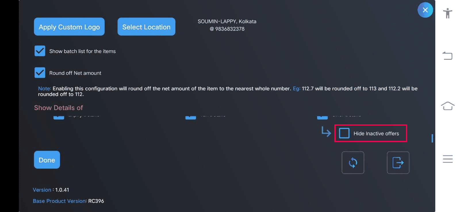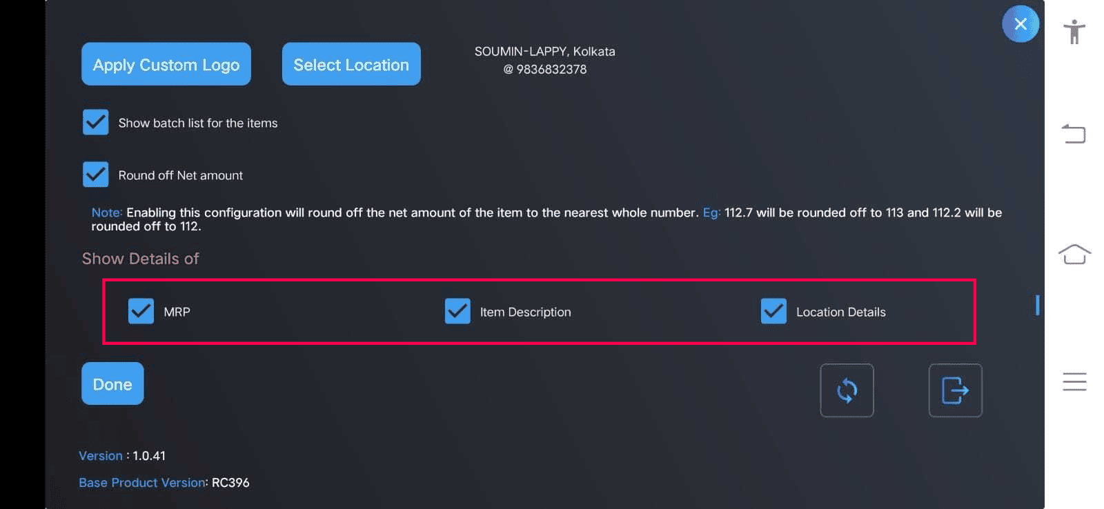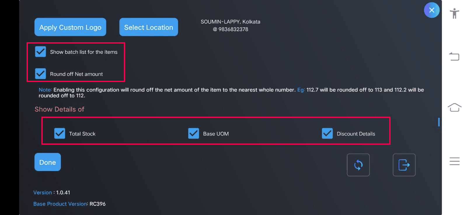 Make sure to tick the boxes next to "Show batch list for the items" to display various batches, and "Round off Net amount" to round the net amount if it has any fractions.