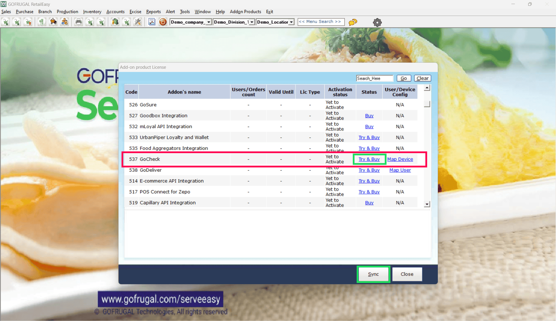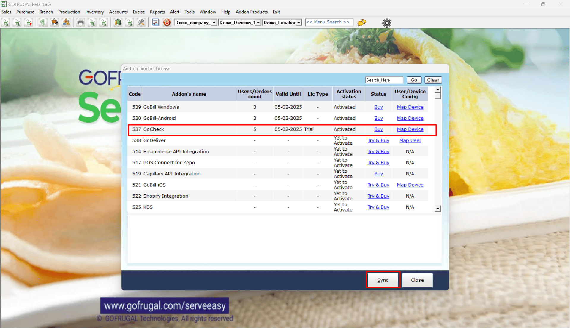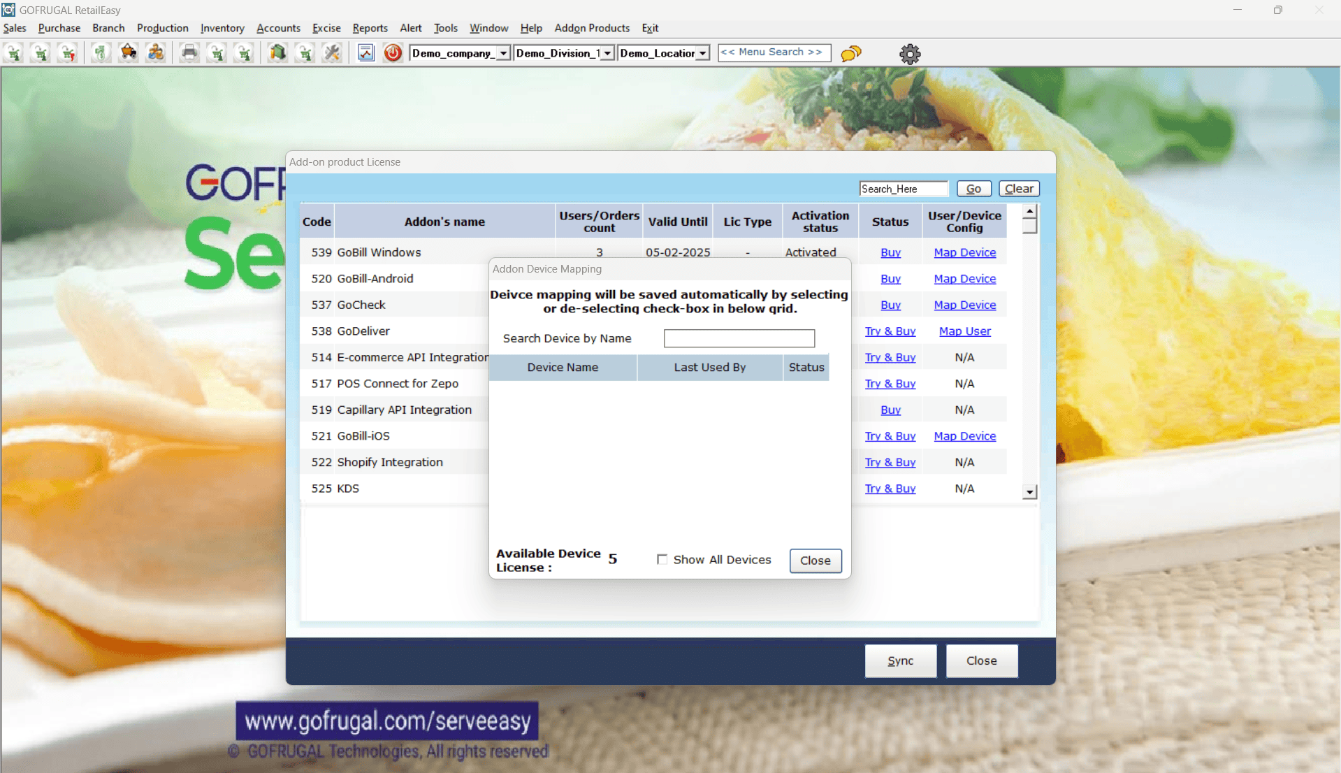 Step 4: Once the synchronization is complete, you'll notice the following details: User/Order count = 5, Valid Until = "The Expiry Date," Lic Type = "Trial," Activation status = "Activated," Status = Buy, and User/Device Config = Map Device. Remember that once the Tab is set up, the name will appear under the mapped devices.