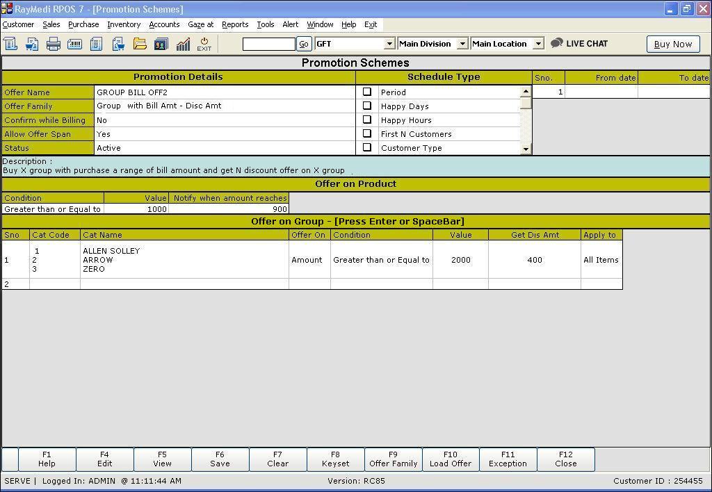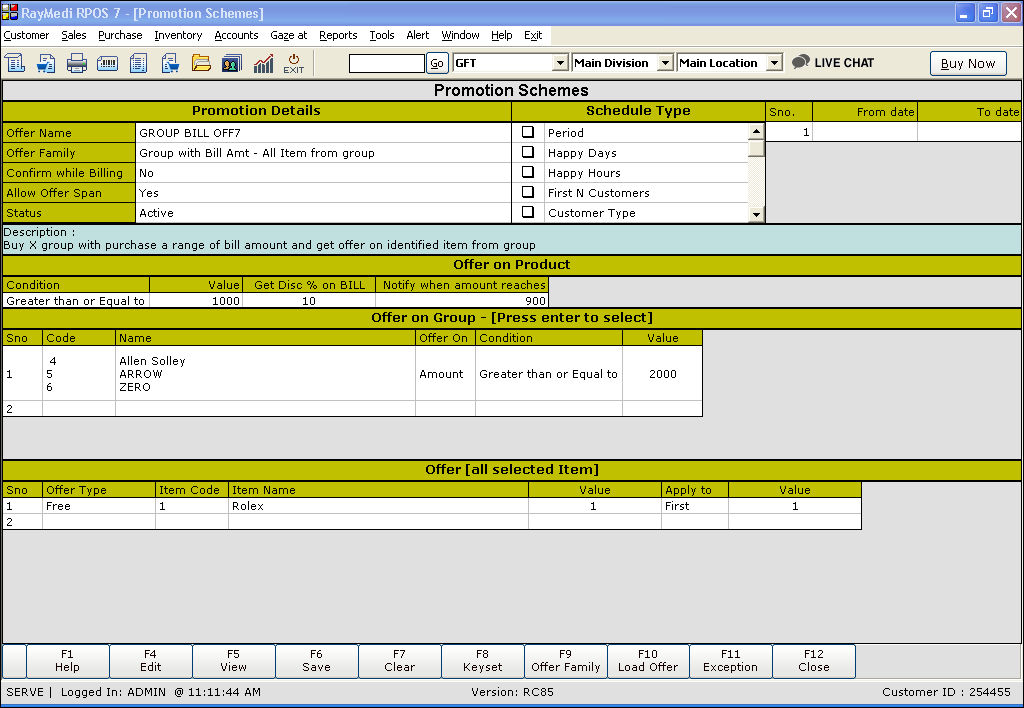 2. Click Save to save the offer.7. Creating Item with Bill amount - All Item from groupUse this offer to give a N% discount on the bill and offer an item free or on a special price/discount.