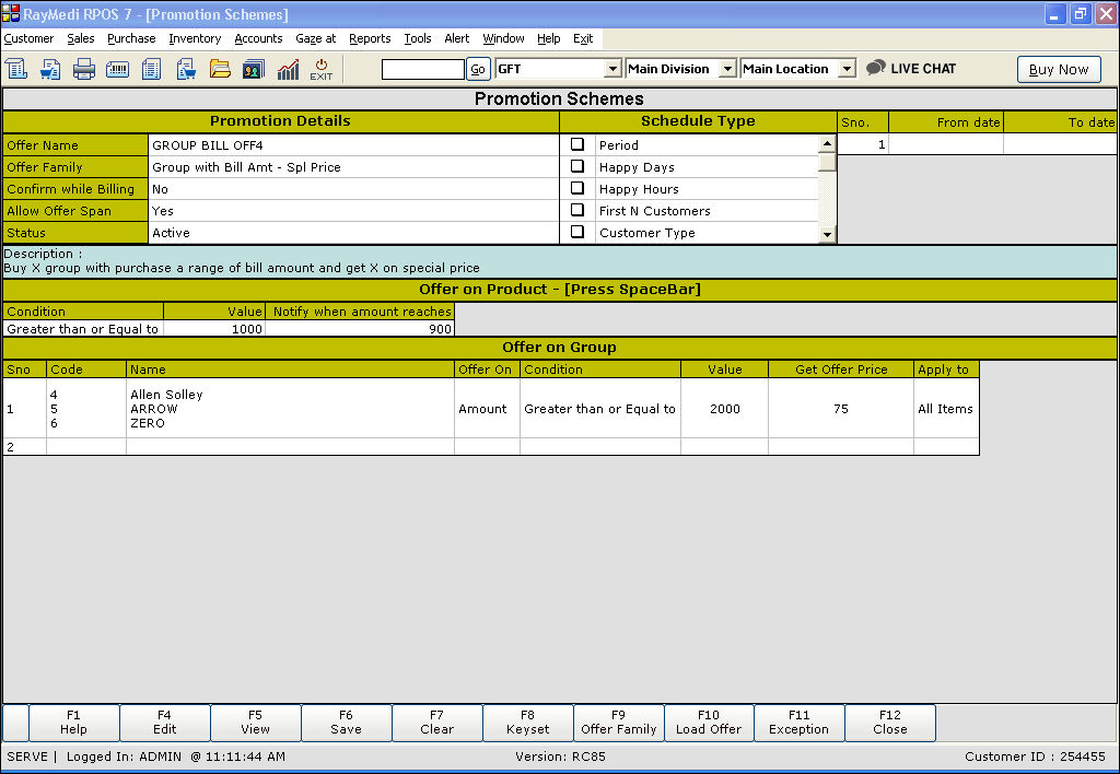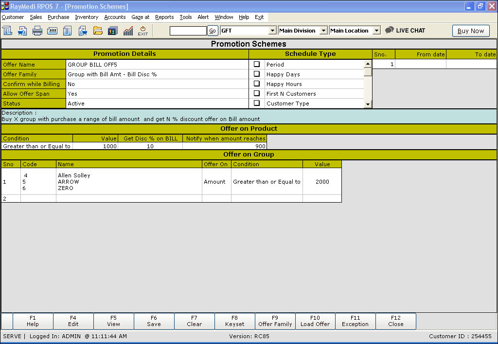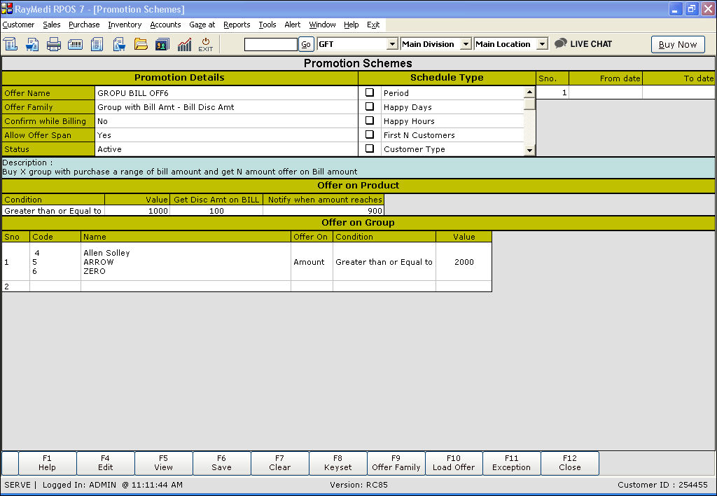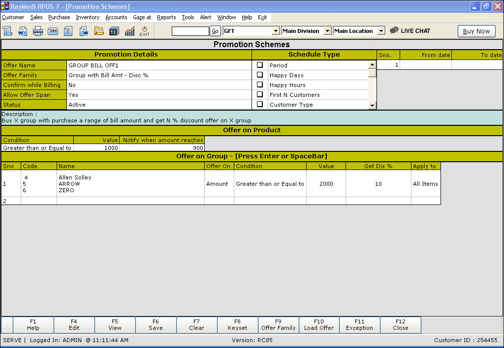 7. Group with bill amount - All Item from the group (To offer on an identified item from a group for the specified bill amount on selling X group)