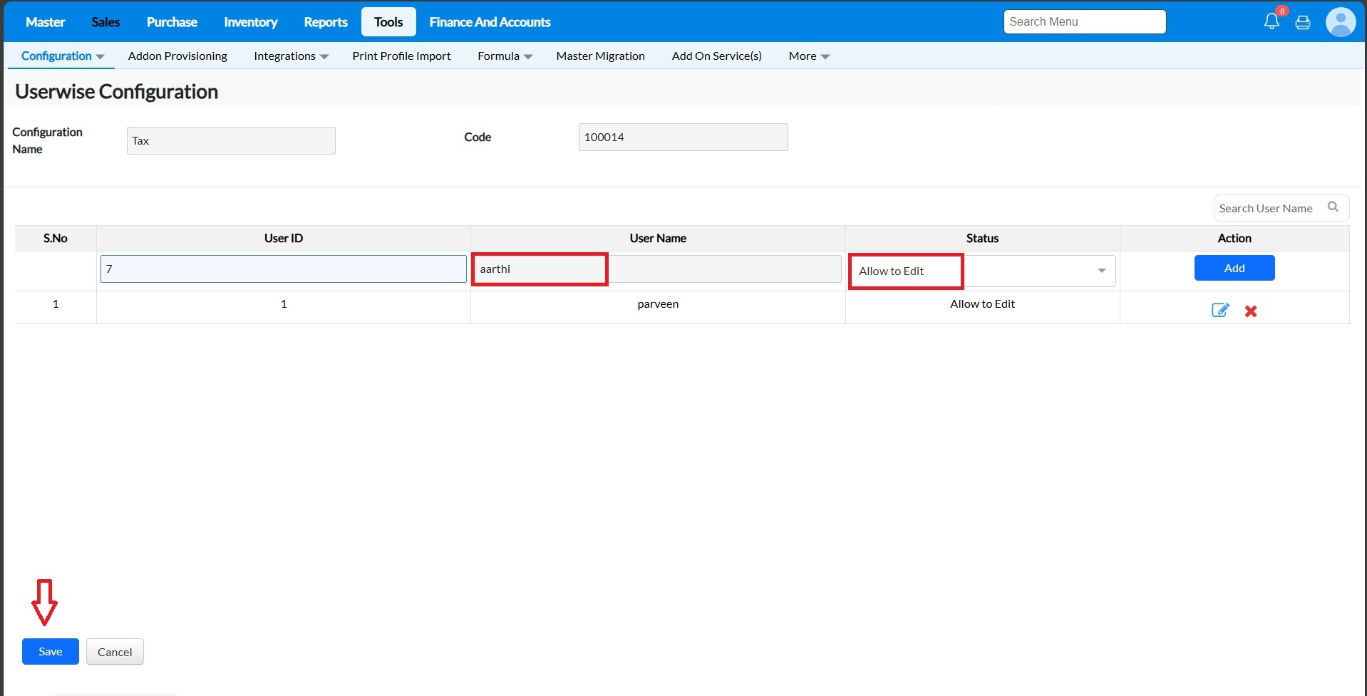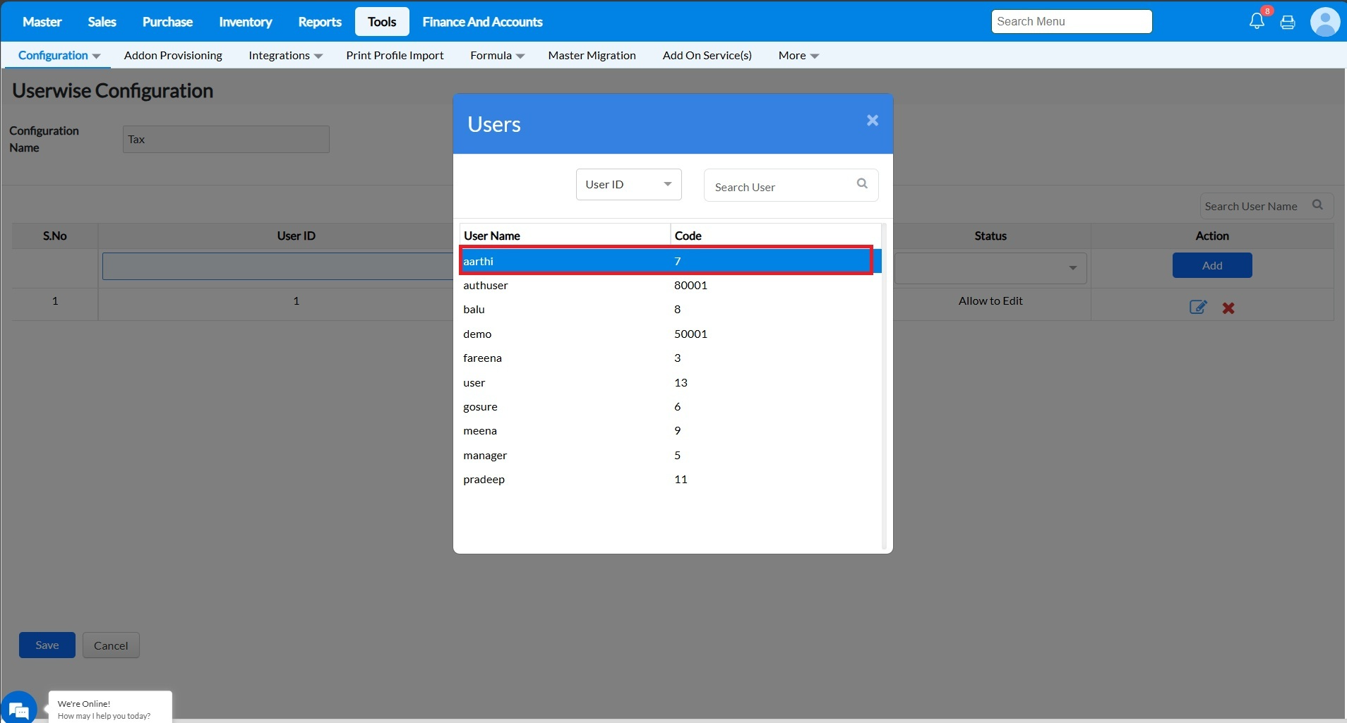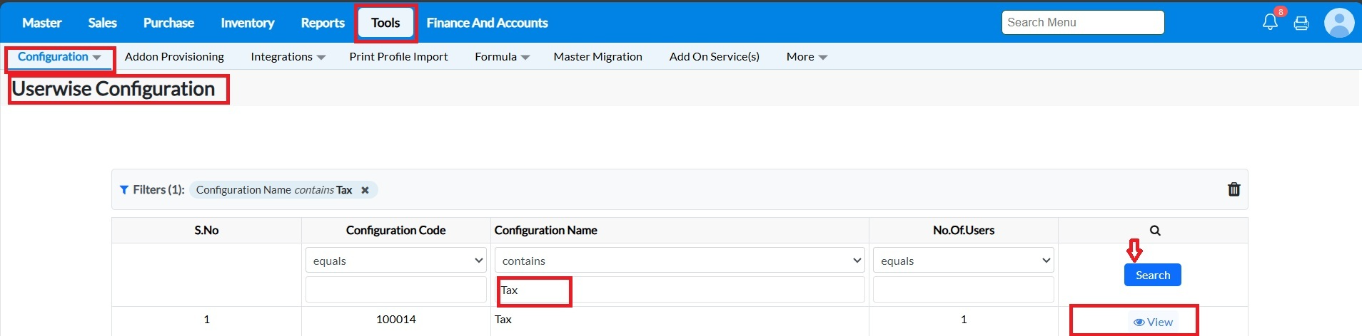 Navigate Tools >> Configuration >> Userwise Configuration >> Search "Tax" ->Click on "View"