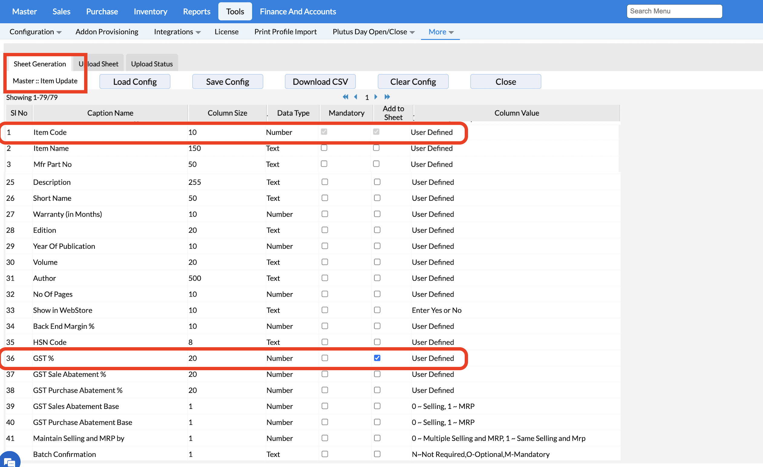 Step 2 - Enable the item code and GST% field in the sheet and download the sheet.