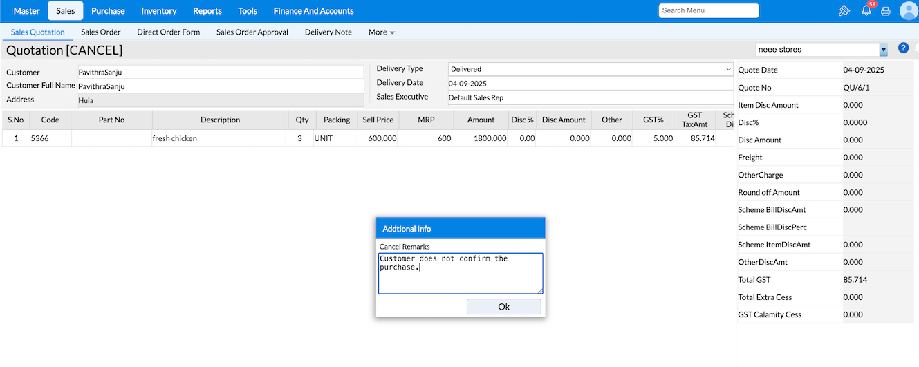 Select a Quot No to be cancelled.