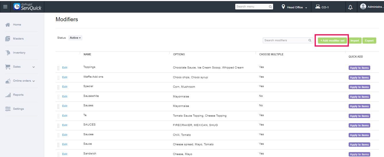 Note: Apply for Online option can be enabled, if the particular modifier is to be shown in the sales screen.