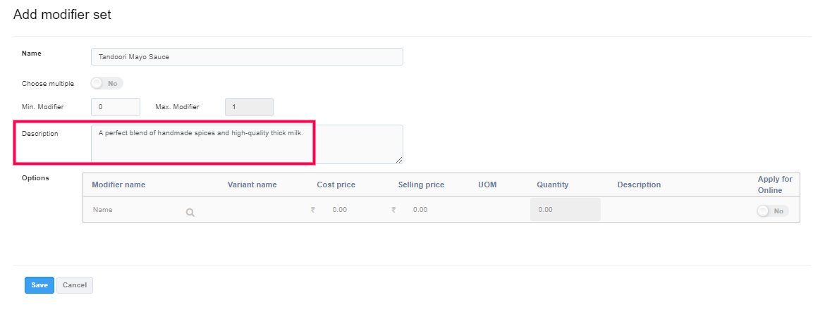 Add a description for the modifier. For example, if you add mayonnaise as modifier, then you can specify the ingredients added to it.