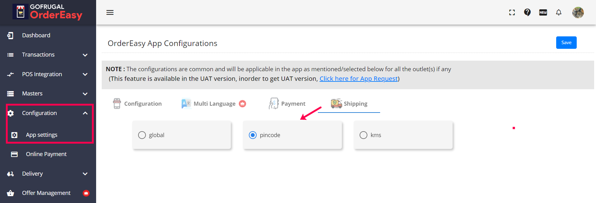 Step 3: You can change the mode of delivery in the App settings by selecting the shipping option at the top